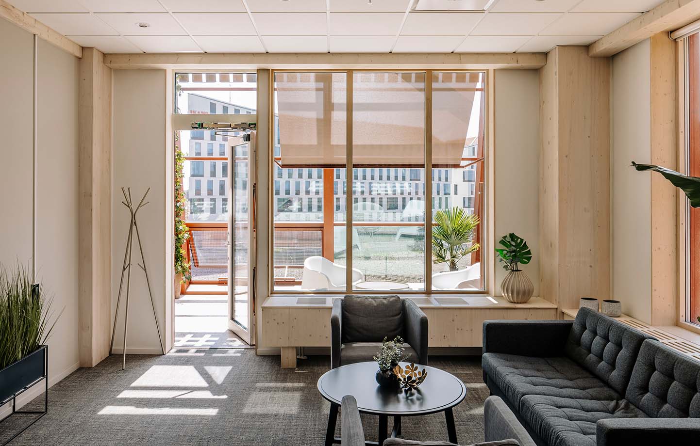– Vi har lagt stor omsorg på utformningen av de nedersta våningsplanen där byggnaden möter gatan. I bottenvåningen finns en generös fyrkantig spiraltrappa där stegen i massivträ låter besökarna uppleva trä på nära håll. Träkänslan lyft även fram högre upp i byggnaden. Ett exempel är i kontorens pentryn där vi har satt en glasskiva som stänkskydd för att exponera den bakomliggande väggen i KL-trä, säger Gustaf Wennerberg, uppdragsledande arkitekt på Wingårdhs.