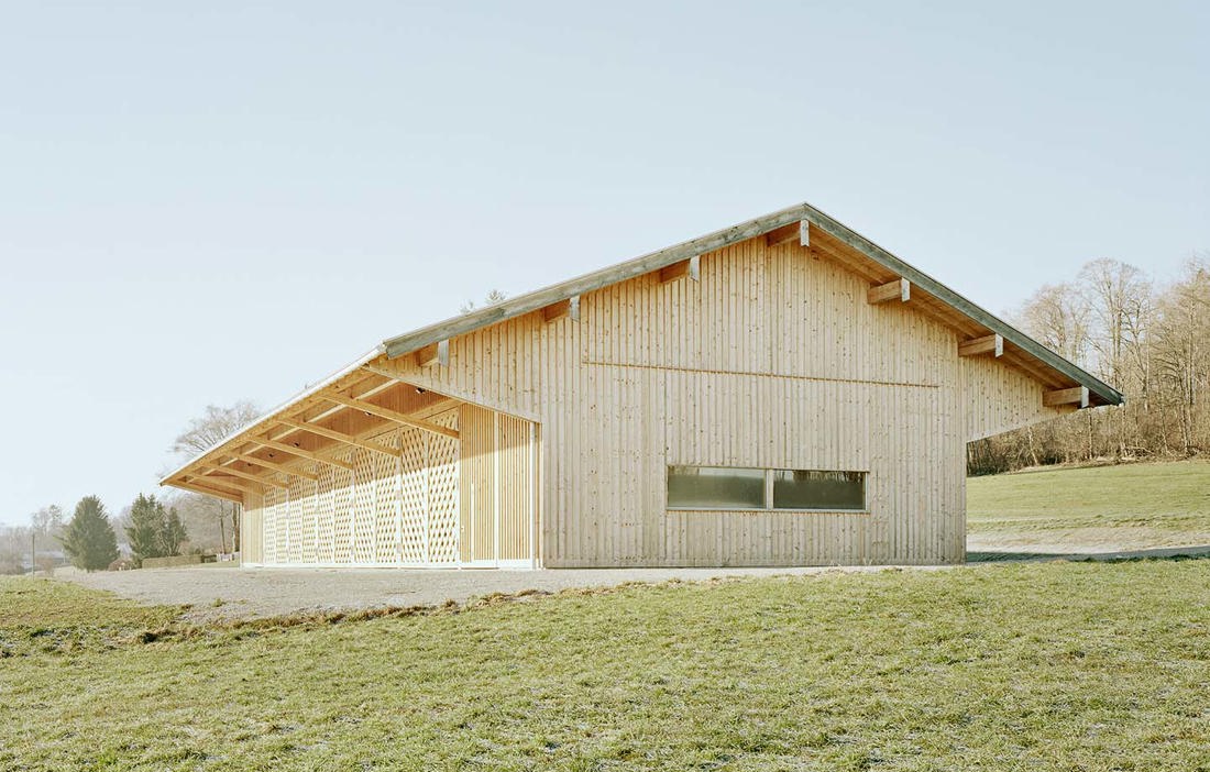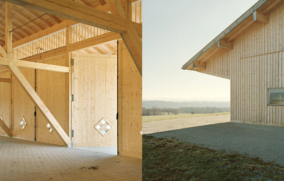 Det går antagligen inte att få en mer lokalproducerad maskinhall än den enkla men smäckra byggnad som står på en äng på den sydtyska landsbygden i harmoni med en äldre, mindre lada. Tillsammans bildar de två byggnaderna en ensemble som ger nybyggnaden en självklar närvaro på platsen, försiktigt insmugen i precis rätt vinkel för att lyfta landskapet snarare än att inkräkta på det.