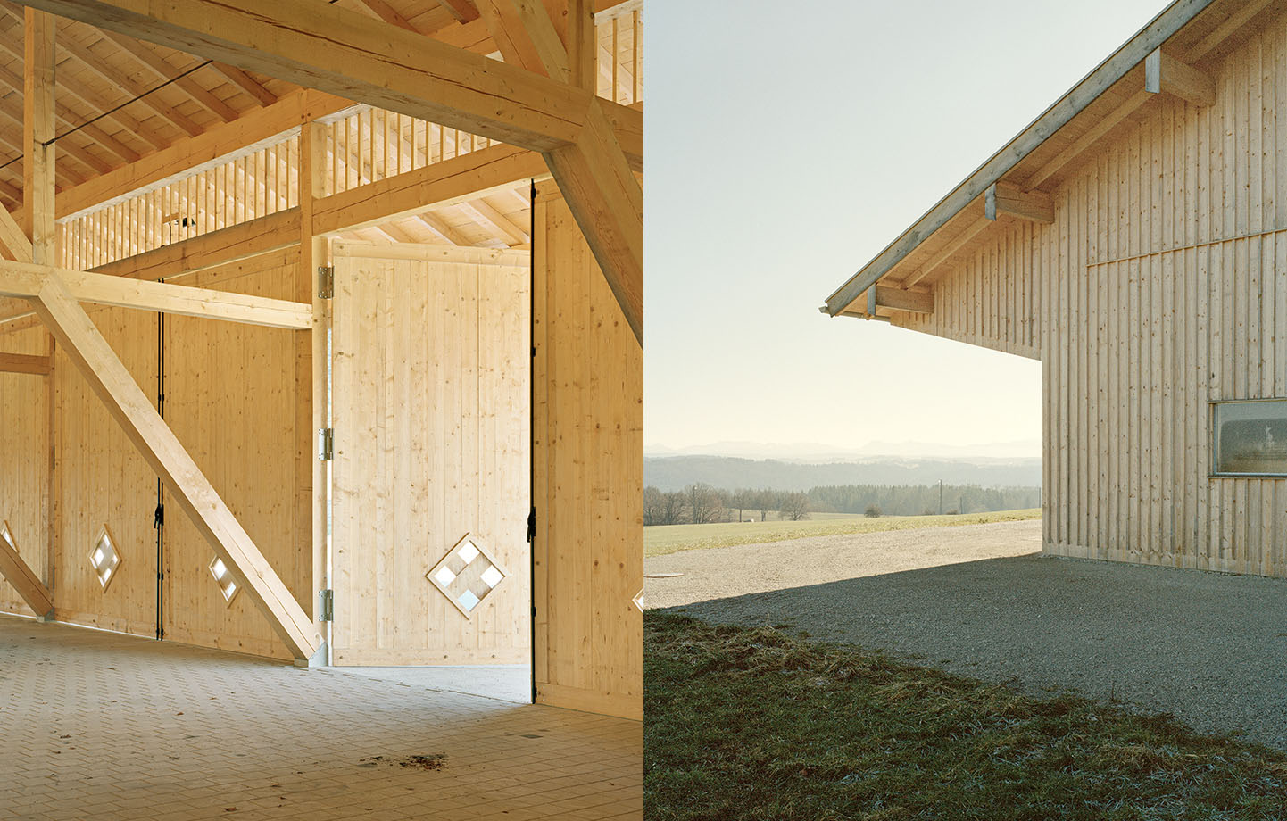 Den nya, större ladan rymmer lantbrukaren Andreas Wachs maskinpark och har även en avdelning för flisförsäljning. Själva gården byggdes 1902 och ligger mitt i byn Irschenhausen i Bayern, men så centralt fanns ingen plats för den nya hallen. Lösningen blev därför att placera den på en äng lite längre bort, där horisontens skogsbryn och kullar bildar en vacker kuliss. Från början hade Andreas Wach bygglov för en prefabricerad, standardiserad hall, en större låda med betongpelare och takbjälklag av limträ, som skulle ge avkall på inramningen och bryta av landskapet på ett mindre angenämt sätt. Så var det tänkt.