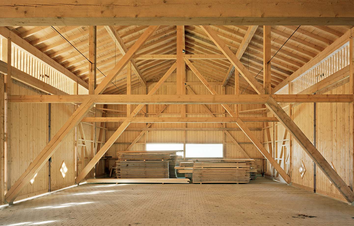Totalt fälldes 200 tallar, 80–100 år gamla och redo för avverkning. Virket fälldes vintertid, lagrades, sågades och lufttorkades i grannsågverket. Därpå kapades det med CNC-fräs och monterades. Allt skedde inom en radie av några kilometer och alla hantverkare kom från trakten. Förutsättningarna var på pappret tämligen enkla: För att två maskiner skulle få rum bredvid varandra behövde centrumavståndet vara 6 meter, och för att rymma gårdens långa maskiner krävdes ett rumsdjup på 12 meter. Florian Nagler architects arbetade utifrån det önskemålet fram en konstruktion av grovsågat timmer i stället för att som mer brukligt använda limträ.