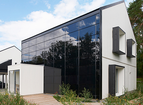 I den bärande konstruktionen ingår också prefabricerade tak- och väggelement av KL-trä, som kopplats ihop med hjälp av fjärilsdymlingar i trä. Infästningarna är en del av ett system som tagits fram för att förenkla framtida demontering.