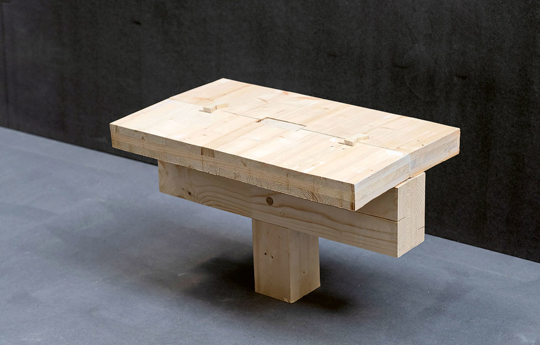Resultatet har blivit en konstruktion med pelar-balklösning, där balkarna trätts på pelarna och fästs med dymlingar av bok.