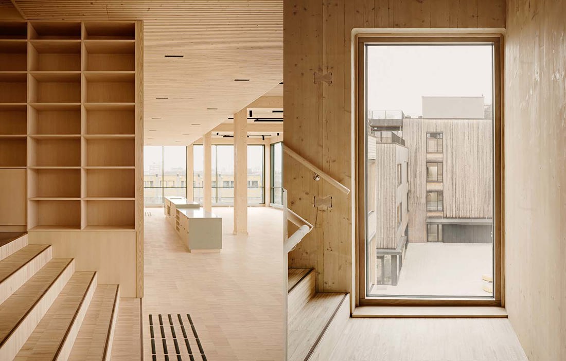 Konstruktionen och ytskikten i byggnaden består av flera olika träslag och andra naturmaterial. Den bärande konstruktionen av limträ och KL-trä är gjord av gran, med infästningar i bok. Innerväggarna är klädda i askfaner och björkfaner, med akustiska inlägg i gran som till stor del är återbrukade. Fasaden är klädd med spån av kärnfuru, och fönsterramarna är gjorda av acetylerat trä. Utöver trapphuset som är brand impregnerat så är alla andra ytskikt i byggnaden obehandlade.
