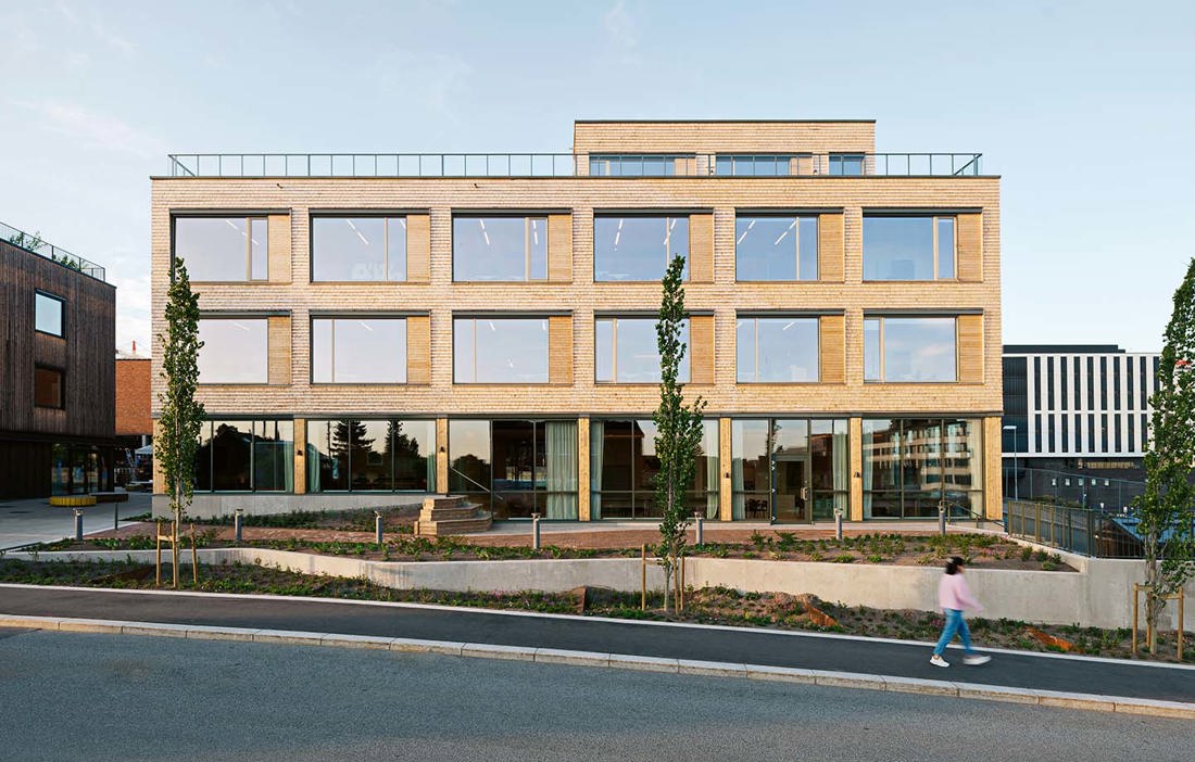 – Vår vision var att rita en byggnad som kunde harmoniera med och underordna sig den här byggnaden som redan fanns. Samtidigt ville vi översätta till det här århundradets byggmaterial som vi menar är trä. Därför har vi klätt fasaden med träspån med inspiration från äldre norsk träarkitektur, som i stavkyrkorna. På så vis knyter vi an till Vinslottets fasad med tegelstenar, men med helt olika byggmaterial. Och precis som Vinslottet har vi designat byggnaden med ett öppet första våningsplan och en tätare kropp när man kommer högre upp, säger Jørgen Tycho.