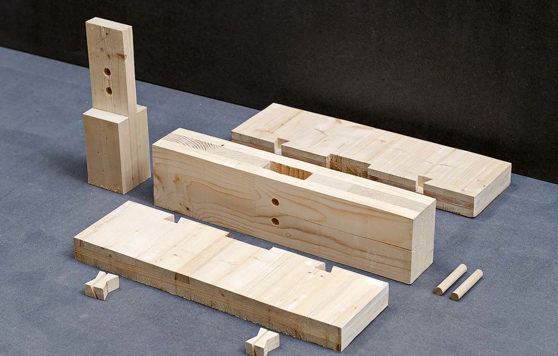 – Bokdymlingarna har torkats ner till 6 procents träfuktighet och bankats in i limträet som håller 12 procents fuktighet. Det gör att dymlingarna suger åt sig fuktighet från limträet och låser fast. Allt bygger på gamla tekniker från förr som vi nu har industrialiserat, säger Jørgen Tycho.