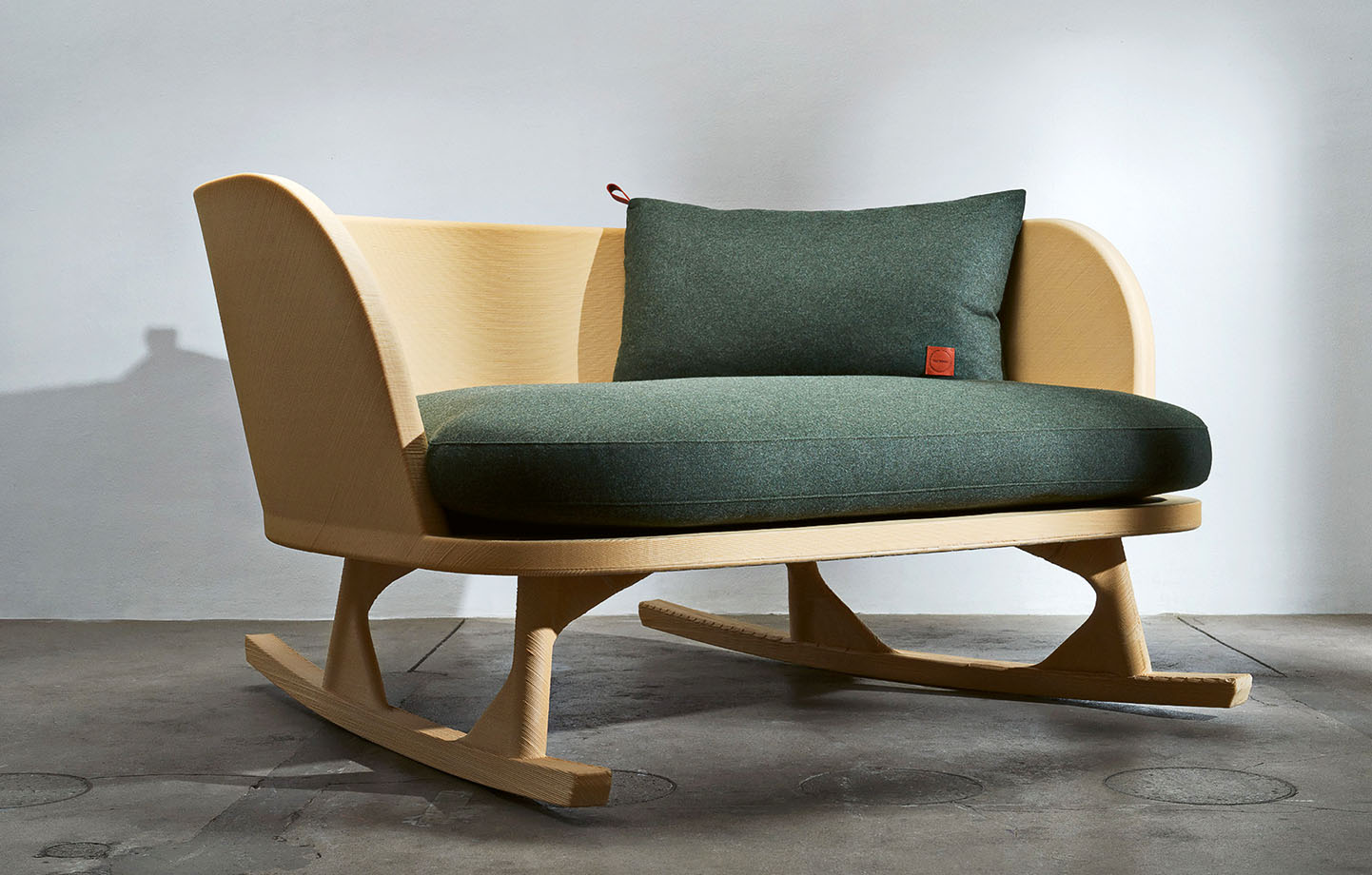 När Johanna Vesterberg, grundare och vd för Normada, formgav den gungande soffan The Nest fanns det från början en tanke om att den skulle skrivas ut. Men det var osäkert om det skulle gå att skriva ut en så stor 3d-detalj. För säkerhets skull tog man fram en version i trä.
