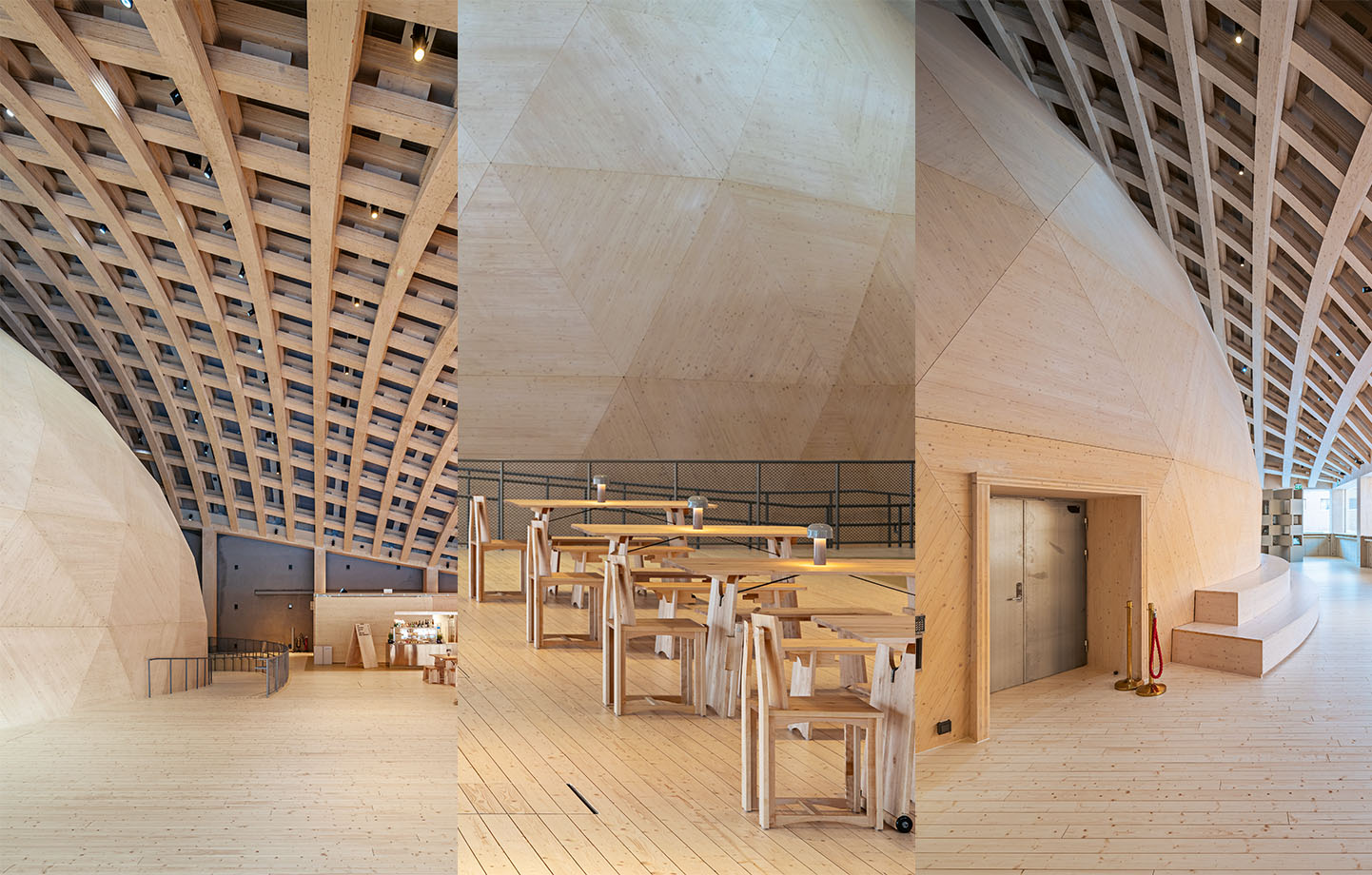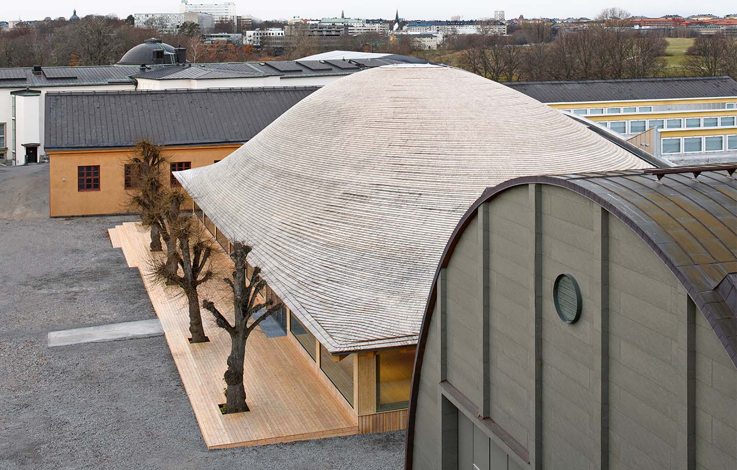 – Den mest självklara lösningen hade varit att låta domen sticka upp ur en lägre volym, men för att skapa en förväntan i själva rummet och en intressant yttre form valde vi att i stället placera domen fritt inomhus. Nu kan trähallen och domen användas oberoende av varandra, och skulle domen inte vara relevant i framtiden kan den monteras ner utan att påverka trähallen, säger Johan Oscarson, arkitekt på Elding Oscarson.