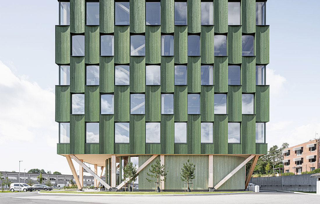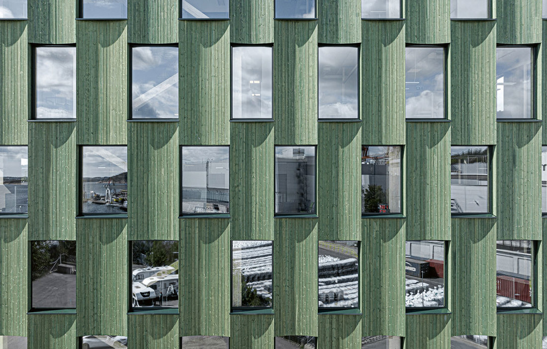 Den sex våningar höga kontorsbyggnaden Lumber 4 i norska Kristiansand är en rationell byggnad med stark identitet. Inspirationen till de gröna, konkava fasadelementen är hämtad från den böljande gröna Nordsjön alldeles utanför – och samtidigt en symbol för byggnadens hållbarhetsprofil.