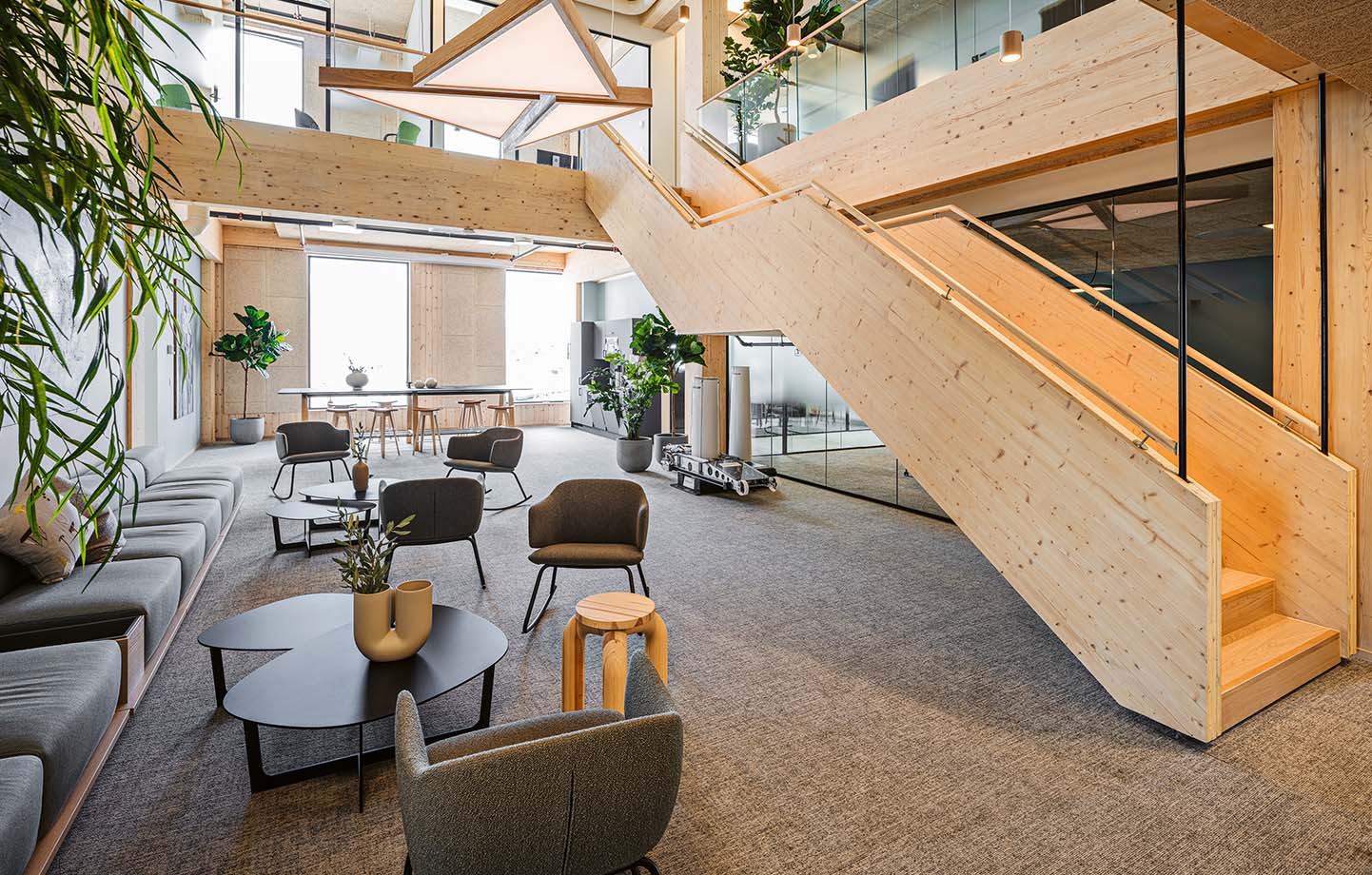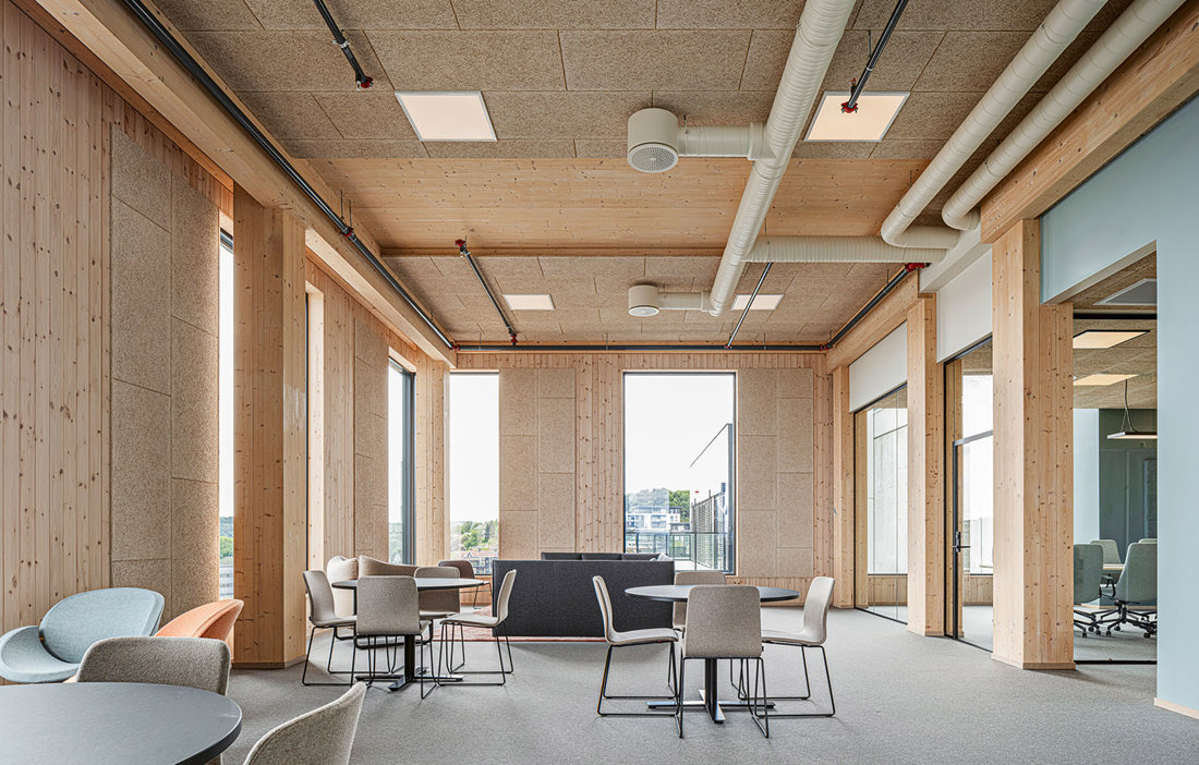 – Eftersom Nekkar, som är den största hyresgästen och ingår i samma koncern som beställaren Skeie eiendom, arbetar med grön energi ville vi skapa en expressiv fasad med träbaserad arkitektur som uttrycker att byggnaden är skapad för en ny, grönare tid. Genom att dra in den första våningen och göra den cirkelformad kunde vi få ett lättare uttryck, samtidigt som vi exponerar de bärande konstruktionerna och tydligt visar att dessa är gjorda i trä, säger Jørgen Tycho, ansvarig arkitekt hos Oslotre, som stått för både arkitektur och träkonstruktioner.