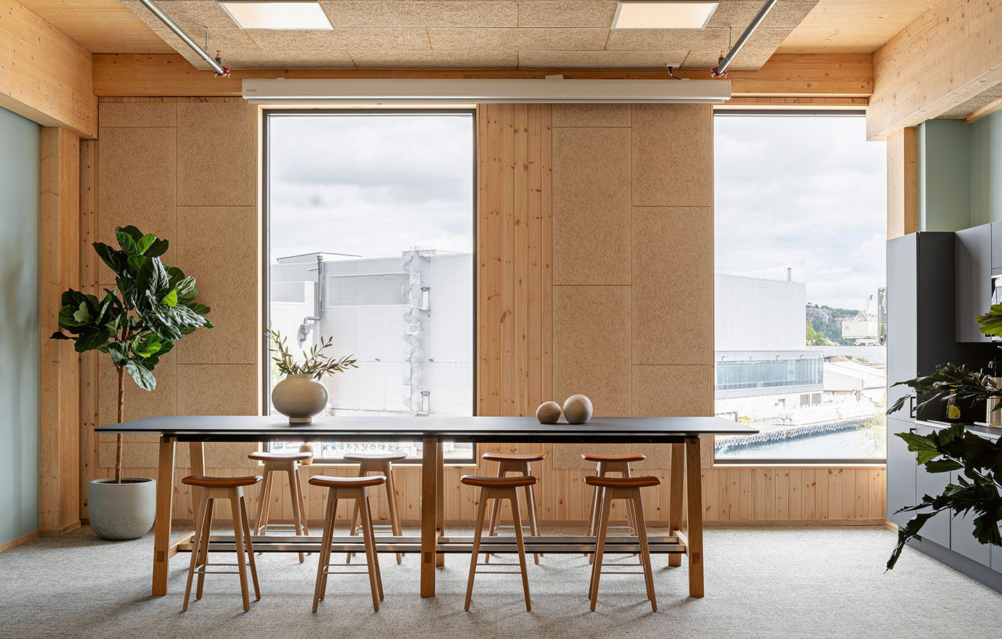 – Vi är väldigt nöjda med vårt nya kontor, inte minst med inneklimatet och akustiken. Kombinationen av träet och de ljusa mattorna skapar lugn och ro och en ombonad känsla. Och det är faktiskt fint med ventilationsrören i taket. När man bygger in taket med plattor blir det lätt lite sjukhuskänsla. Nu känns det mer industriellt, vilket passar bra med tanke på omgivningarna, säger Ole Falk Hansen, vd för Nekkar.