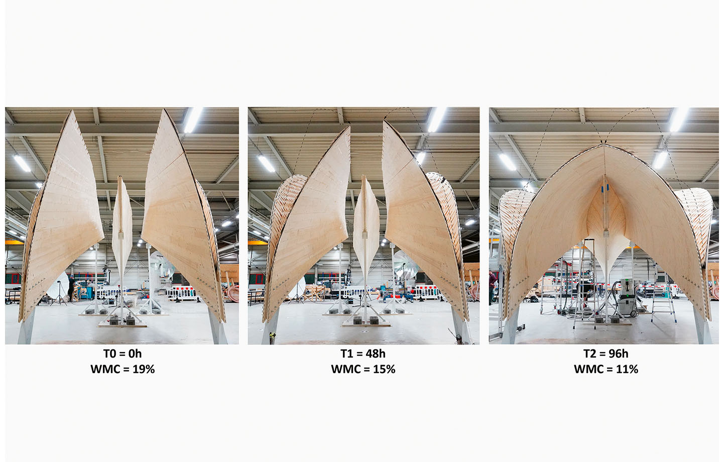 I ITECH:s pavljong Hygroshell, vid Chicagos arkitekturbiennal 2023 visades ett fullskaleexperiment på hur träets fukthalt och torkningsprocess kan utnyttjas och skapa skalkonstruktioner av lamellträskivor jämförbara med dem i betong under 1900-talets början. Med hjälp av digitala modeller som beaktar virkets anisotropa fuktegenskaper kunde Hygroshell utveckla både ny teknik och design.