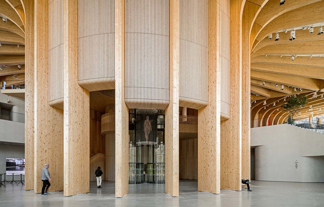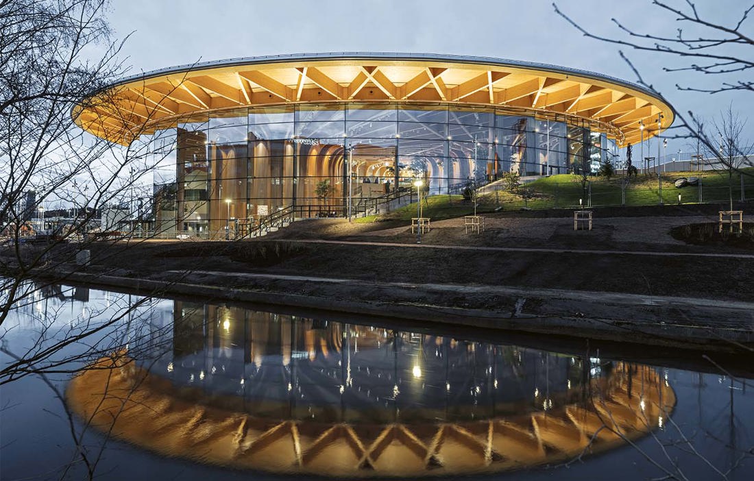 – Hela byggnaden har en diameter på 90 meter från glasfasad till glasfasad. Om man ritar upp en perfekt trekant inne i den cirkeln så ligger respektive trädstam på mittpunkten av varje sida i triangeln. Genom att placera dem så blev det möjligt att variera storleken på dem. Utifrån trädstammarna kunde vi sedan fläta ihop pelare och balkar i en takkonstruktion som gjorde att vi kunde undvika fler pelare. På så vis har vi fått stora sammanhållna utställningsytor och möjlighet för skrymmande fordon att köra in och ut ur byggnaden, berättar Martin Stenberg Ringnér.