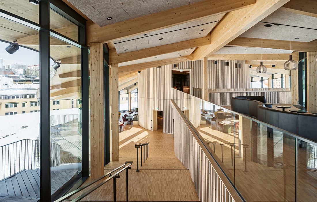 Förutom bottenvåningen är hela den bärande konstruktionen gjord av limträ och kormäter 34 meter, vilket innebar vissa logistiska utmaningar.