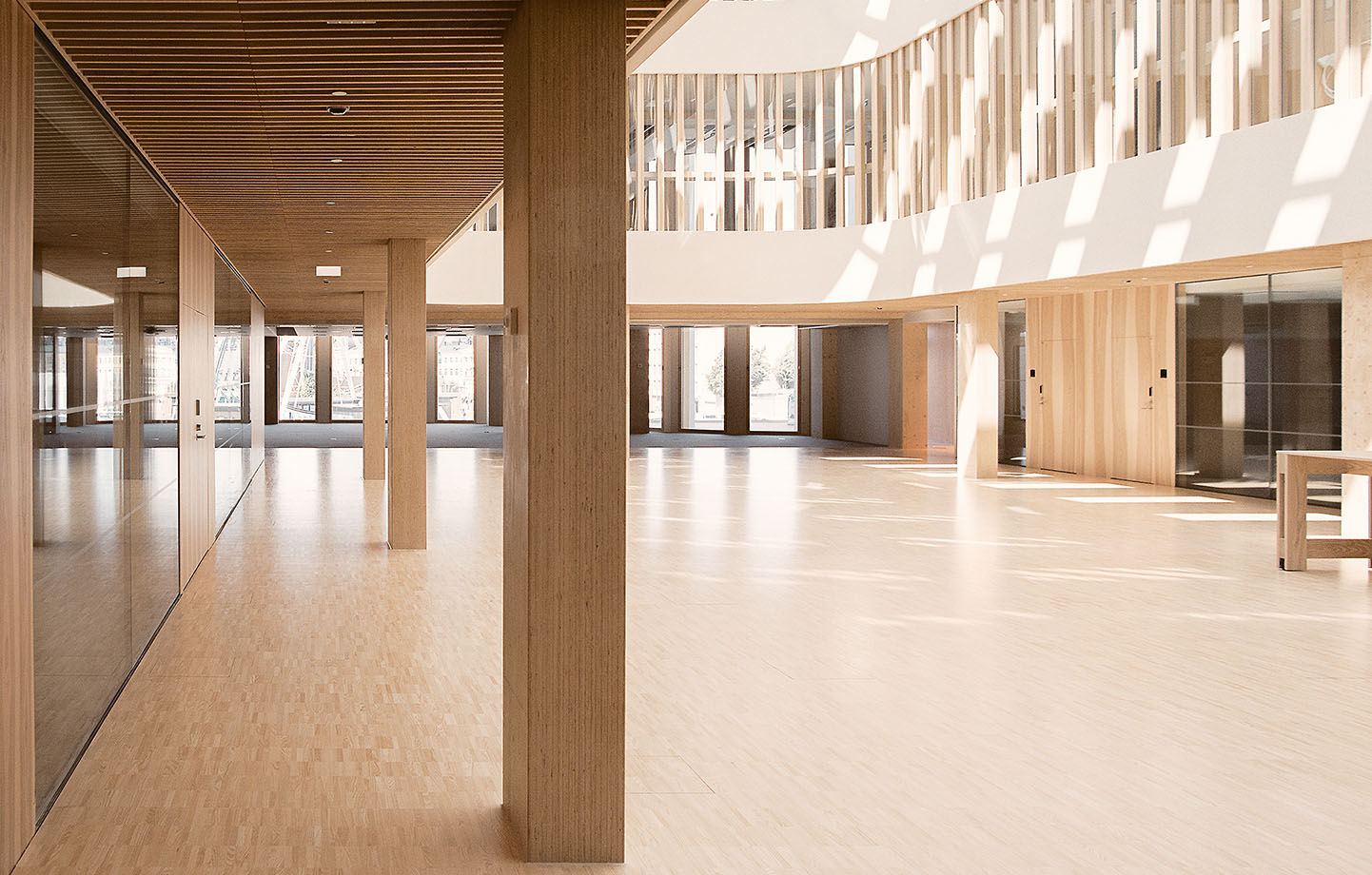 Byggnadens flöden stödjer både samarbete och effektivitet. Entréplanet innehåller kontors- och hotellreceptioner, utställningsytor, affärslokaler, restaurang, kafé och flexibla konferenslokaler som alla visar upp Stora Ensos träprodukter i olika tillämpningar. De övre planen är organiserade i olika typer av mångsidiga arbetsutrymmen och sociala ytor. I källaren ryms tekniska utrymmen och ett parkeringsgarage som optimerats genom ett automatiserat parkeringssystem. En central ljusgård sträcker sig hela vägen genom byggnaden där ljuset landar på en stor, cirkulär träbänk.