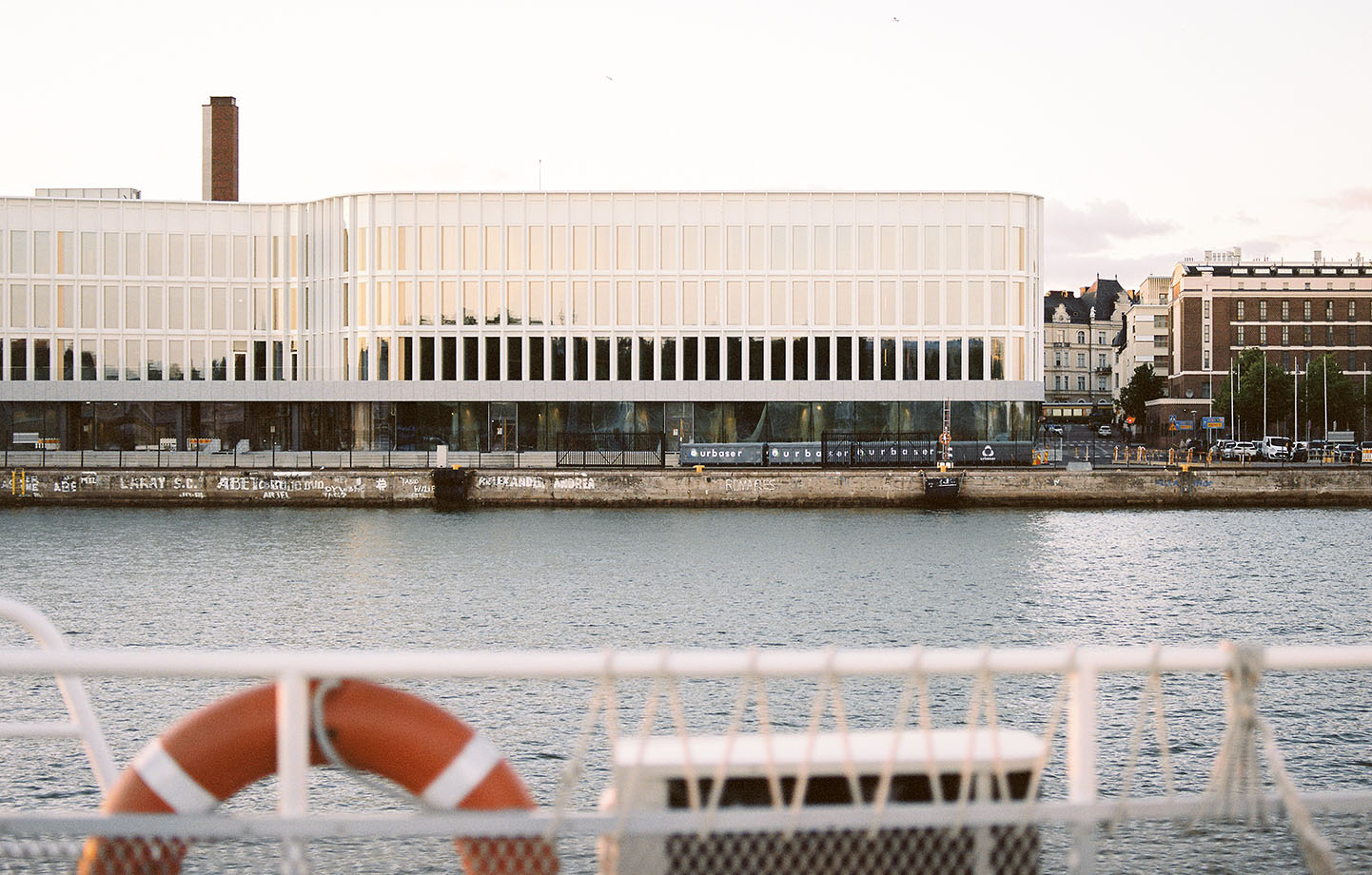 Den exteriöra dubbelfasaden har en organisk böljande form som bryter upp den långsträckta blockstrukturen, inspirerad av hamnens historiska magasin och lagerbyggnader. Formen skapar skyddade innergårdar och öppnar för varierade vyer mot den omgivande stadsbilden och landskapet. Fasaden dämpar effektivt det lågfrekventa bullret från hamnen och färjetrafiken samt skyddar trästommen från de tuffa förhållanden som den havsnära placeringen innebär.