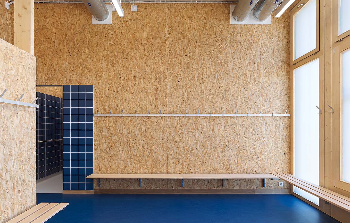 Fokuset på obehandlade material sträcker sig från stomelementen till ytskikten, vilket skapar en kontinuitet mellan interiöra och exteriöra ytor. För utrymmen som hade akustiska krav, som idrottshallarna, användes perforerade paneler. Men även här sparsamt, ljudnivån är högre än vad som skulle ha tillåtits i en permanent byggnad.