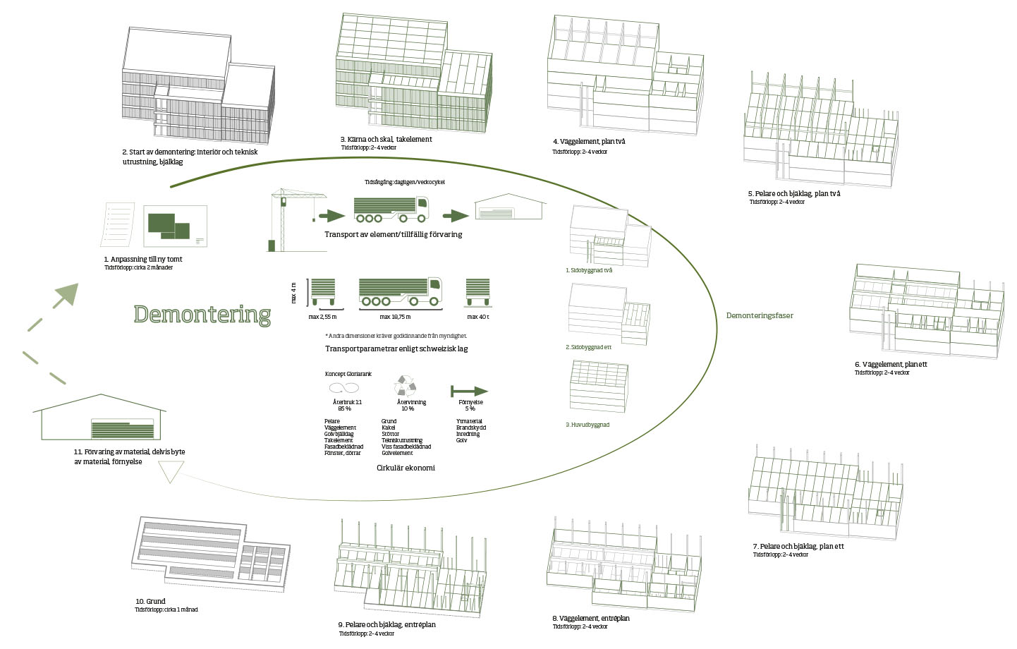 En lärdom var att jobba med obehandlade material där det var möjligt, för att möjliggöra en cirkulär design. Stomsystemet använder en pelar-balklösning, där de två nedre hallarna använder limträbalkar av lövträ som klarar längre spännvidder utan att bli för kraftiga, medan den översta våningen med mindre hallar har klarat sig med limträbalkar av gran. Fasaden är designad för att kunna demonteras, med paneler fästa med standardskruvar, även om vissa kompromisser av praktiska skäl behövde göras på några mer svårtillgängliga områden.