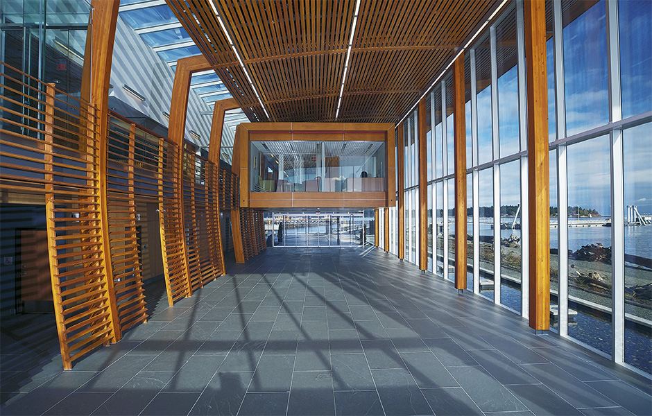 Hållbarhetstänket går som en röd tråd genom Nanaimo Cruise Ship Terminal. En stor del av träet är hämtat lokalt och stenplattorna i byggnaden värms upp av solen och släpper sedan ifrån sig värme under dagen ut i den stora ankomsthallen.