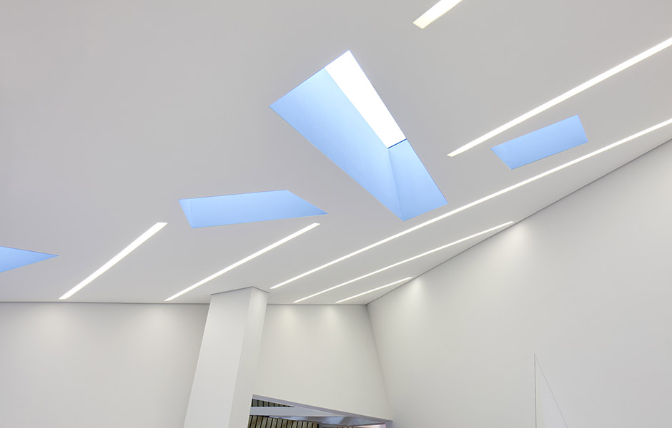 Lanterninerna som vilar ovanför Akademins träinklädda entréparti är inspirerade av de två hebreiska bokstäverna Alef och Bet. De är också en påminnelse om att lärdom och kunskap är väsentliga delar av den judiska kulturen. Innanför entrén möter två stora volymer som innehåller bibliotek och en hörsal. Även här spjärnar väggarna i trä åt olika håll för att aktivera utrymmet däremellan, helt i enlighet med mottot In-Between Spaces som även är Libeskinds titel för tillbyggnadsprojektet.