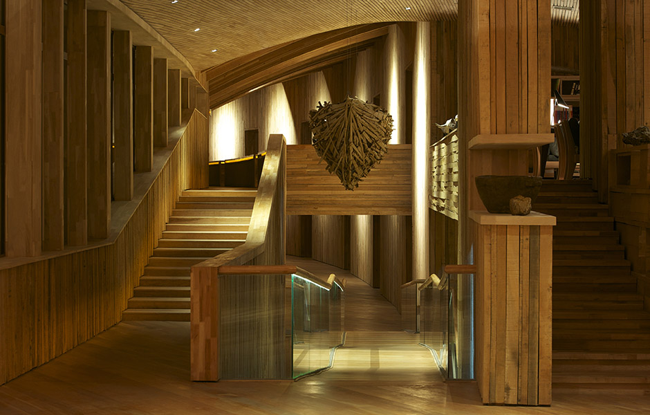LENGA VALDES FÖR dess tuffa och slitstarka egenskaper. Materialet klarar av de stora påfrestningar som hotellet får utstå på tundran men träslaget valdes även för sina estetiska kvaliteter. Väggar och tak klädda i lengaträ är trevliga att vila ögonen på. Likaså de knotiga, solblekta trädgrenarna och krokiga bjälkarna i tak och räcken. De mjuka trägolven inbjuder till att gå barfota. Samtidigt är interiören utformad för att inte ta fokus från det hänförande landskapet utanför hotellet. Väl värt att titta närmare på är inredningen som följer en chilensk estetik med avskalad design och enkla möbler. Cazu Zegers har tillsammans med designerna Alexandra Edwards och Carolina del Piano försökt knyta samman natur och hotellmiljö genom att använda former och material från omgivningen. Lampor, trappräcken, hängare, fällar och annat är tillverkade av chilenska hantverkare i lokala material som trä, läder och ull. Tillsammans formar de en avslappnat lyxig miljö utan att bli pråligt.