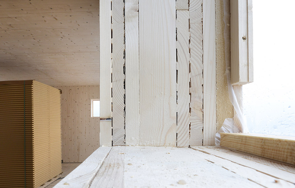 Konstruktionen är en vidareutveckling av konceptet »Holz100«, en teknik som utvecklats av österrikaren Erwin Thoma. Det hela är enkelt, 20 pluggar per kvadratmeter håller samman alla lagren av trä på ett naturligt sätt.