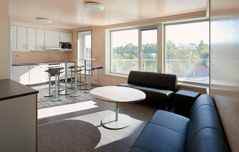 ATT ANVÄNDA TRÄ i så stor utsträckning medför dock vissa utmaningar, varav ljudisoleringen är en av dem. Något som kan kännas extra viktigt i ett studentboende där en pumpande stereo kan stå på ena sidan en vägg och en tentapluggande student sitta på den andra. Genom att montera dubbla väggar och tak mellan lägenheterna kunde resonansfrekvensen minimeras. En annan viktig aspekt för ett säkert boende är att brandsäkra byggnaderna.