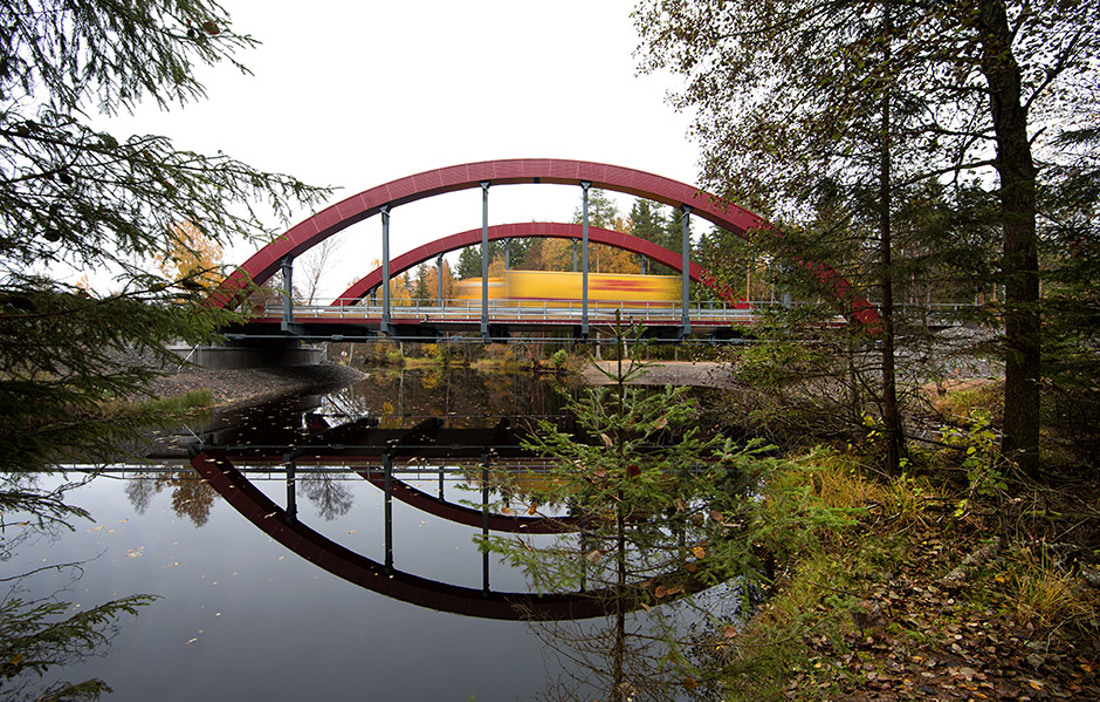 TVÅ MÄKTIGA BÅGAR av limträ spänner över Nissans mörka vatten. Riksväg 27 har fått en ny sträckning tack vare Sveriges längsta frispända vägbro i trä. När bron utanför Gislaved invigdes i början av oktober var det efter bara sex veckors monteringsarbete på plats. Träbron tillverkades i fabrik och transporterades därefter till arbetsplatsen.