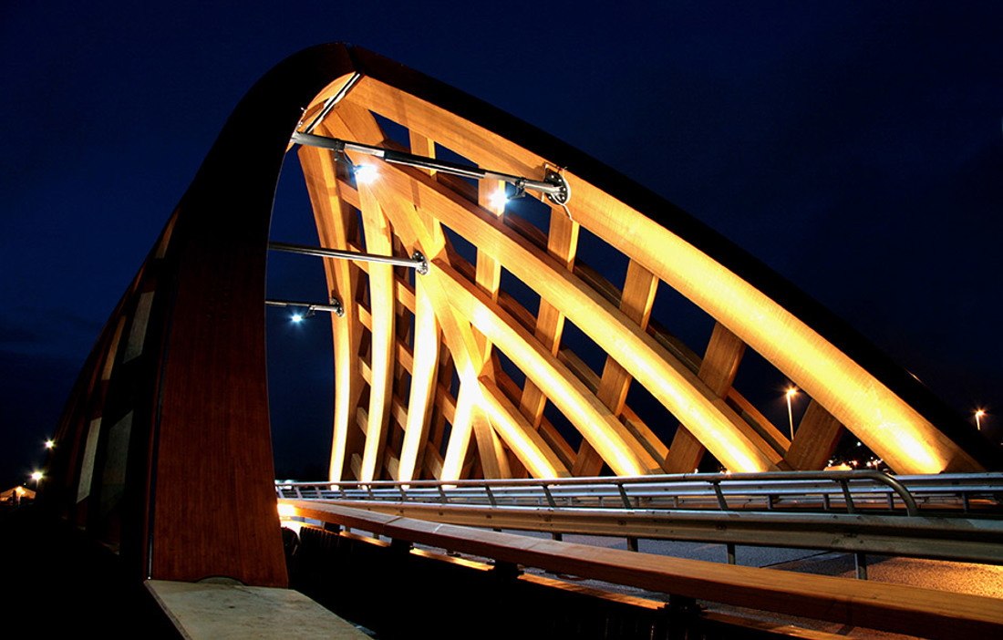 Varje bro består av två välvda bågar som bär upp en 32 meter lång och 14 meter bred brobana. Höjden är 16 meter. För att klara tung trafik och leva upp till beställarens övriga krav behövdes trä med mycket hög prestanda. Valet föll på accoya som i det här fallet skapats av odlad tall från Nya Zeeland. Träet har tryckimpregnerats med ättikssyraanhydrid, så kallad acetylering. Genom den behandlingsprocessen har träet fått egenskaper som liknar tropiskt hårt trä, med hög motståndskraft mot mögel och insektsangrepp.