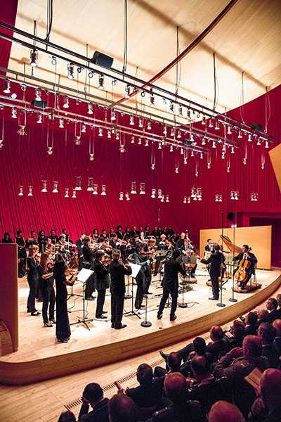 – Att få perfekt akustik i lokalen var en av våra största utmaningar. Vi ville få auditoriet att fungera som ett musikinstrument och det var därför naturligt att genomgående använda trä. Vi hängde upp lärkträpaneler inuti auditoriet för materialets förmåga att förbättra akustiken. Det som är så speciellt med lärk är att det inte har några defekter. Det återger och förstärker ljud helt perfekt, säger Paolo Colonna, ansvarig arkitekt för projektet hos RPBW.
