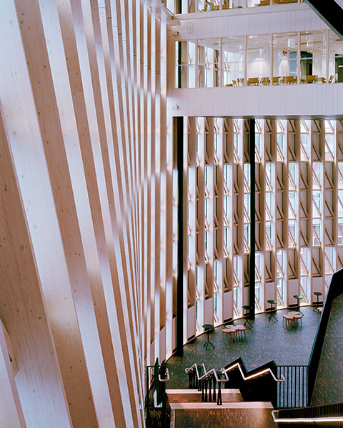 – Trä har många fördelar. Inte minst eftersom en trästomme bara väger en tredjedel av vad en betongstomme gör. Det påverkar både transporterna och grundläggningsarbetet. När man som i Aula Medica har en fasad i glas slipper man kallstrålning då de omgivande träytorna alltid är varma och behagliga.