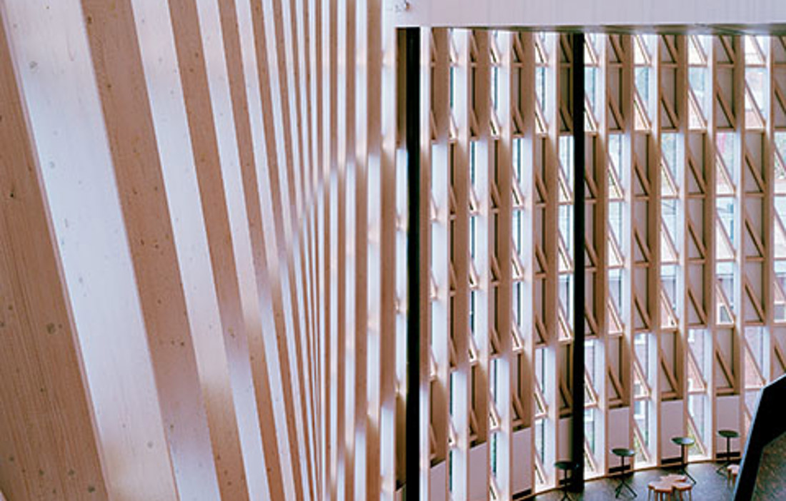 Interiört återkommer trianguleringen från fasaden på flera platser. Panelundertaket i foajén har utfrästa linjer vars triangelmönster vittnar om en yrkesskicklighet och ett precisionshantverk utöver det vanliga. Väggarnas lätta och luftiga panel i vitlaserad furu förstärker husets nordiska karaktär liksom golvet i rökt och vitlaserad ek. Det är ssc Group i Skellefteå som tillverkat och monterat all fast inredning. Trots att man gärna tar sig an komplicerade projekt, medger företagets vd Peter Forssell att Aula Medica inneburit en utmaning lite utöver det vanliga.