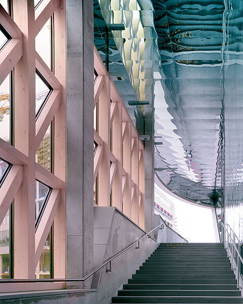 FASADKONSTRUKTIONEN ÄR SEPARERAD från byggnaden, som kan röra sig fritt utan att fasaden påverkas. Även om den övergripande formen är dubbelkrökt, är fasaden inte byggd som en äkta dubbelkrökning eftersom alla limträpelare är raka och glaselementen plana.