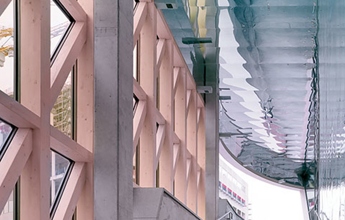 Det tjeckiska företaget Fenestra Wieden har levererat både glaselement och limträstomme. Pelarna är prefabricerade i exakta längder och kom till byggplatsen som ett jättelikt plockepinn.