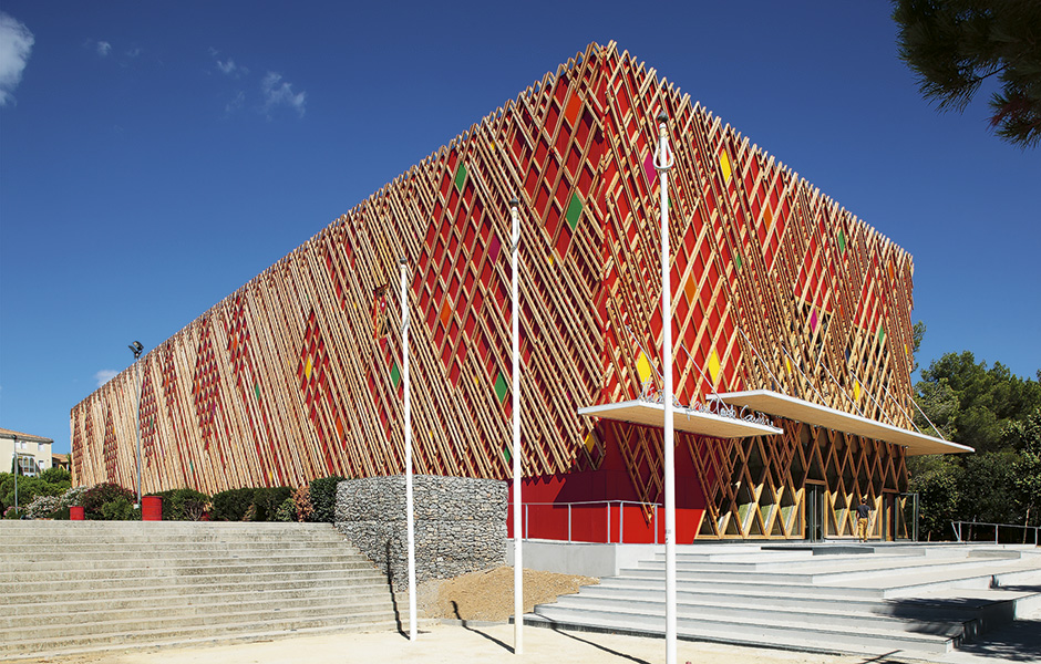 Inne på Théâtre Jean-Claude Carrière är det dock knäpptyst. Alla ljud stängs effektivt ute – och inne – av teaterns dubbla träväggar med isolering. Teatern ligger mitt i parken Domaine d’O, franska Montpelliers 23 hektar stora kultursatsning med konstutställningar, festivaler och events. Théâtre Jean-Claude Carrière, som fått sitt namn efter en känd fransk manusförfattare född i området, är parkens senaste tillskott och byggd helt i trä. Teatern reser sig som en färgsprakande kub, mitt i parken bland tallskog, olivträd och trevliga små trädgårdar som gjorda för en söndagspicknick.