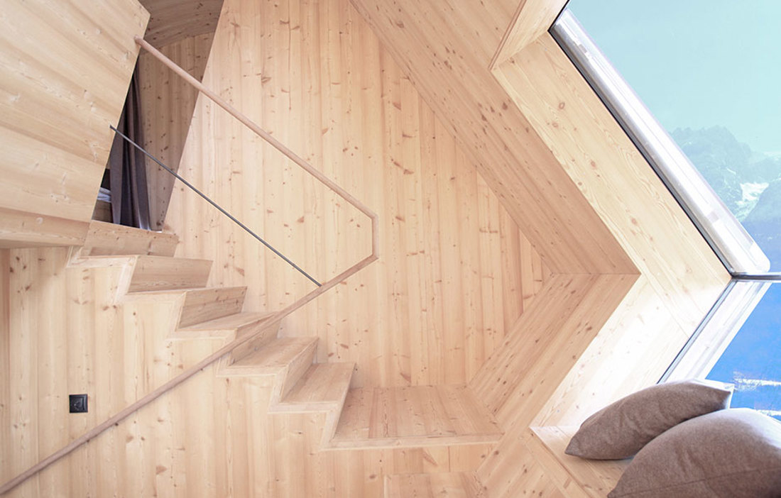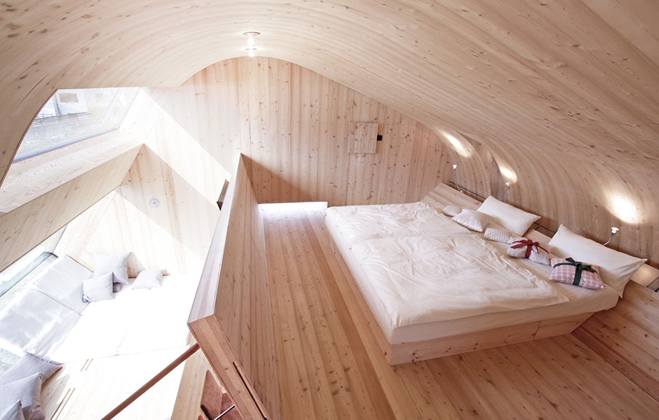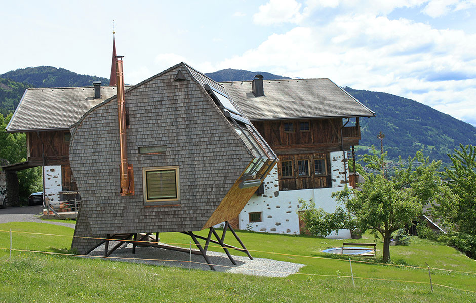 I DE ÖSTERRIKISKA Alperna, inte långt från Wien, står en kolossal träfågel och spanar ut över bergen. Eller är det ett UFO? Arkitekt Peter Jungmann gav sitt märkliga hus namnet UFOgel – något som anspelar på blandningen av en fågel och något utomjordiskt. Den stora träkonstruktionen, nästan uteslutande byggd i lärk, vilar på stora ben av stål och svävar på så sätt i luften. Även invändigt består byggnaden av lärkpaneler som ger en varm och ljus känsla. Valet av material kom naturligt då det finns en lång tradition av att bygga med just lärk i området.
