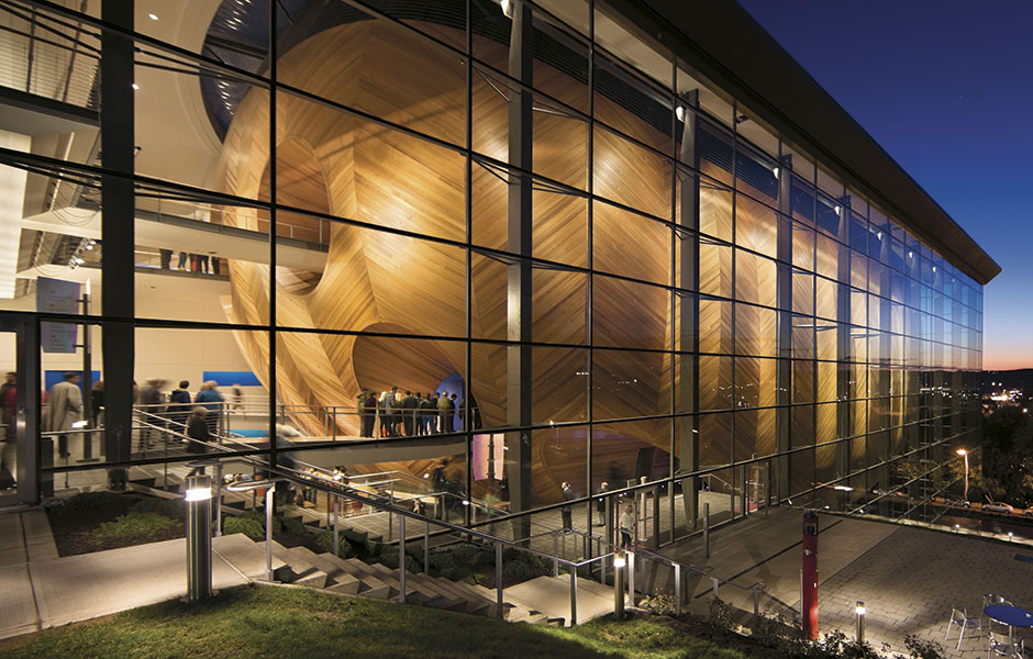 Formen påminner om ett fartyg. Det yttre skrovet är av glas medan det inre, som tycks sväva i ett eget universum innanför glashöljet, är konstruerat av cederplank. Broar leder från foajén in i konserthallen som rymmer 1 200 sittplatser.«
