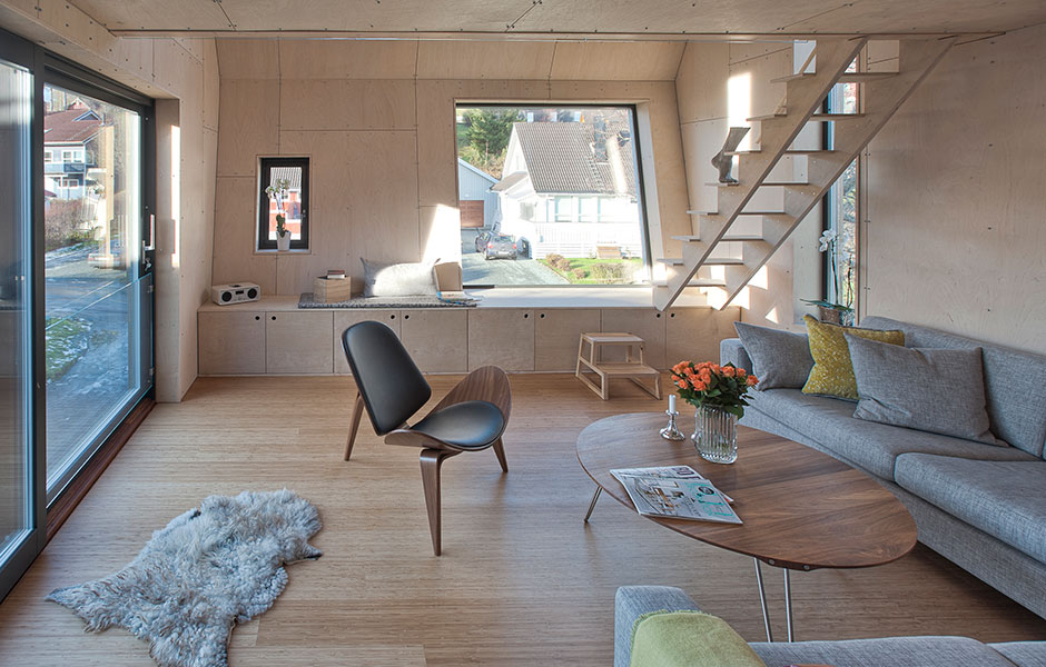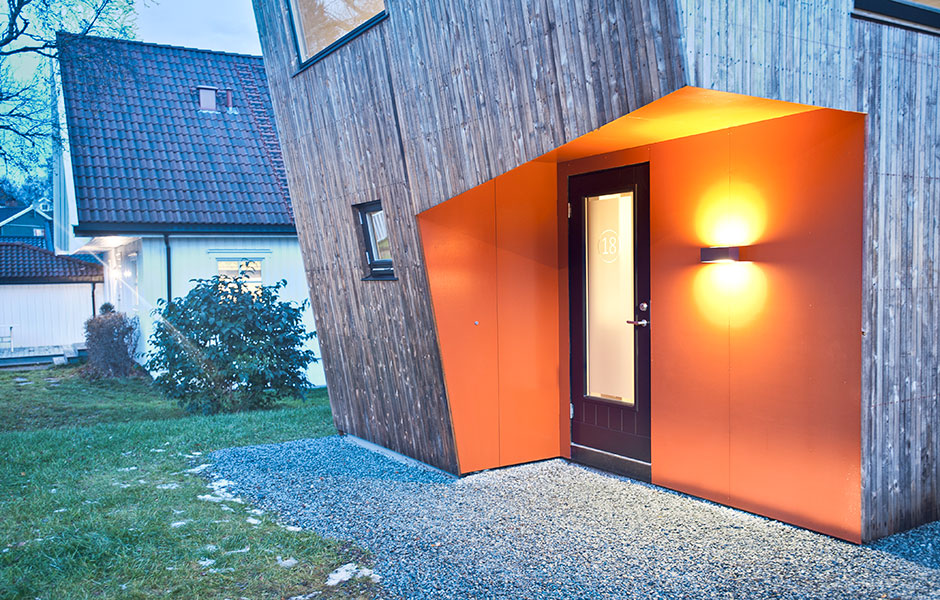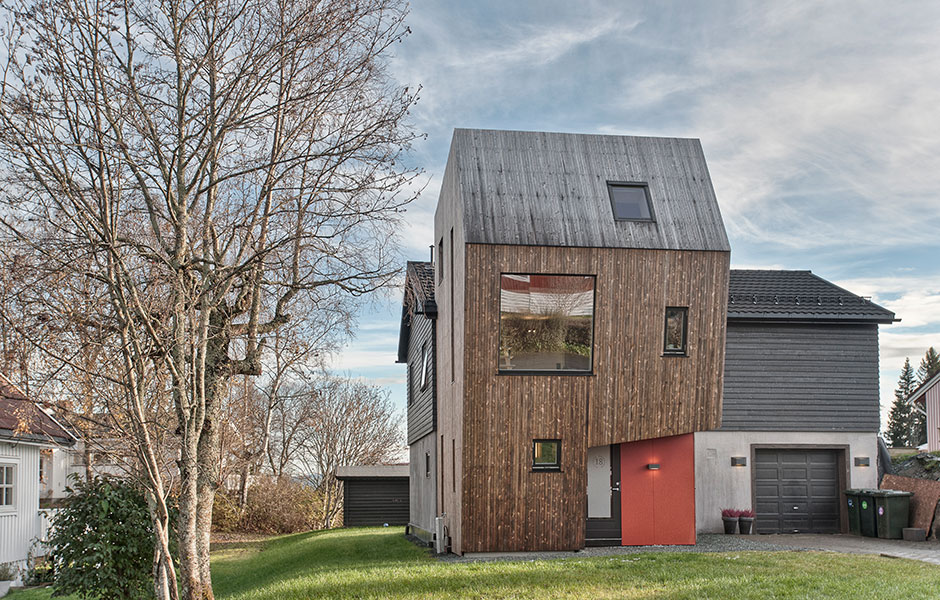 Fasaden är klädd i naturligt behandlad furu: samma miljövänliga material som när arkitekterna ritade om båthus till sommarbostäder i norska Møre och Romsdal. Formmässigt sticker den nya tillbyggnaden ut från övriga hus i området, men med sina naturnära färger smälter den ändå in.«