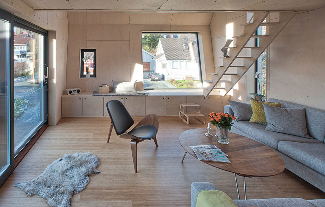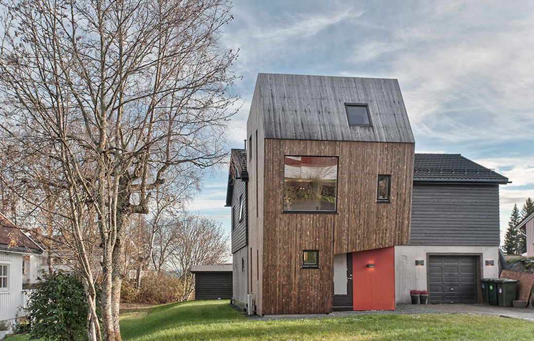 Tyin Tegnestue tog på sig ansvaret som totalentreprenör och axlade även den ekonomiska risken. De skapade en tillbyggnad med trettio centimeter tjocka väggar och ett halvmetertjockt tak. På markplanet finns en välkomnade entré med en kombinerad tvättstuga och badrum. På det andra våningsplanet finns nu ett rum med högt i tak som familjen använder som ett slags multirum – för vila, arbete och skapande.
