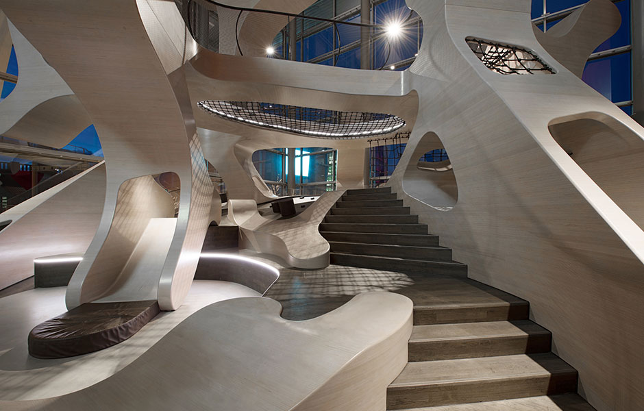 ETT INTERIÖRT LANDSKAP av trä invigdes förra året på Volkswagens besökscentrum i Wolfsburg, Tyskland. På en yta av 1 600 kvadratmeter kan barn och vuxna klättra, hänga och leka kurragömma. Formen på den fantasifulla massiva träkonstruktionen är inspirerad av den välbekanta pet-symbolen.