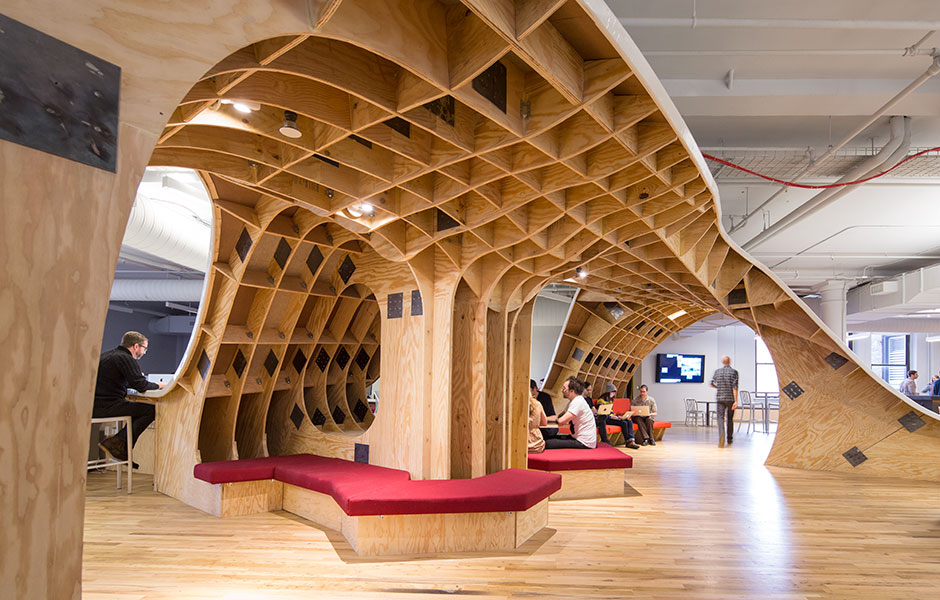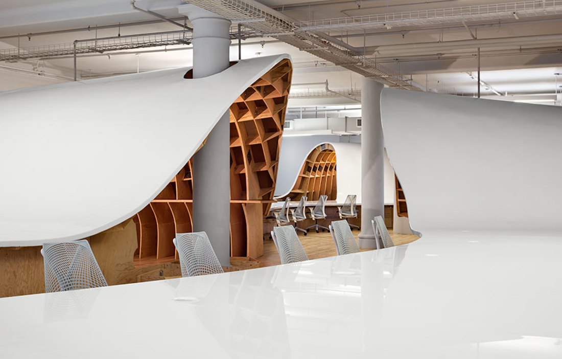 VASSA KONTORSLANDSKAP ÄR inredningsarkitekterna på Clive Wilkinsons signum – de utvecklar arbetsplatsmiljöer som främjar en positiv atmosfär och som svarar på varje företags unika behov. Detta framgår tydligt i ett av deras senaste projekt där de på uppdrag av reklambyrån The Barbarian Group i New York designat ett »superskrivbord«.
