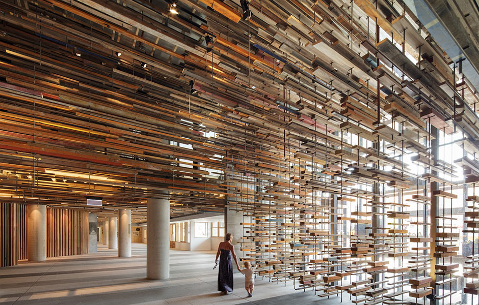 ATT GÅ GENOM lobbyn på det australiensiska hotellet Hotel Hotel är som att simma i ett hav av trä. Bara takstrukturen består av 2 150 trästycken. Ytterligare tusentals bitar av återvunnet trä är fäst runt väggarna och skapar oregelbundna mönster kring byggnadens prefabricerade betongpelare.