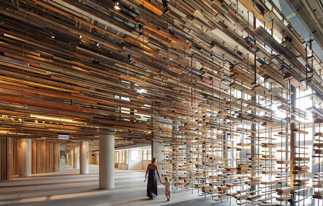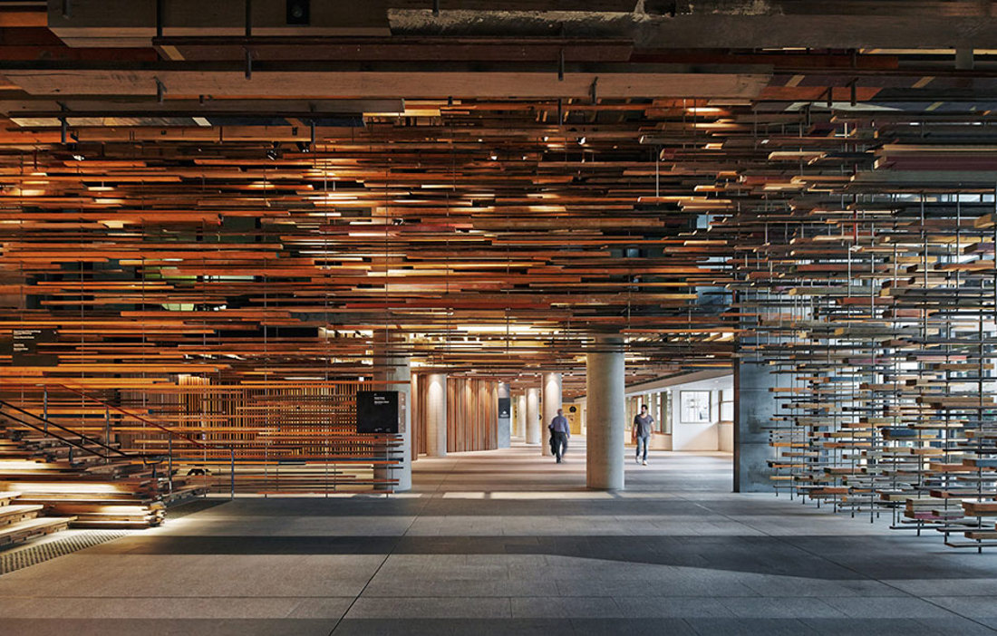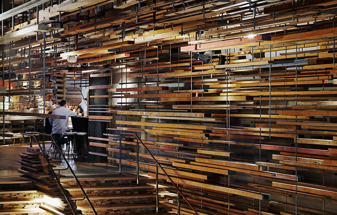 March Studio har designat lobbyn liksom den magnifika trappa som skapats genom att ordna staplar av återvunna plank bredvid varandra. Allt trä har samlats från byggarbetsplatser i närheten och mycket av virket kommer från trädet Blackbutt som växer i de kustnära skogarna i New South Wales och Queensland.«