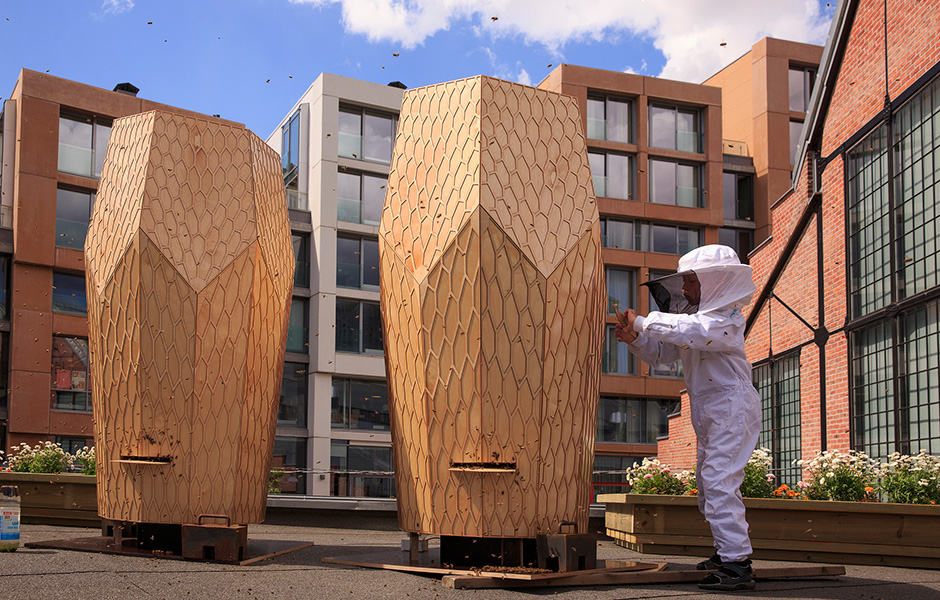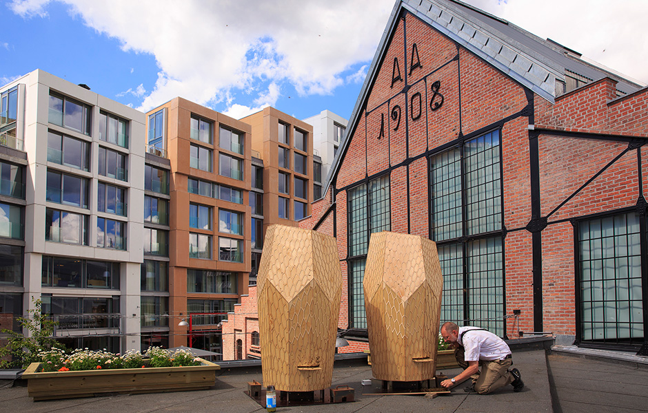 Skapelserna liknar två kantiga skorstenar och tanken är att sprida kunskap om hur viktiga bin är för världens matproduktion. Saluhallen säljer också honungen som bikuporna producerar. De två bikuporna ska rymma 160 000 bin och är byggda i björk och lackade i en ton för att likna honungsfärgen så mycket som möjligt, enligt Snøhetta.«