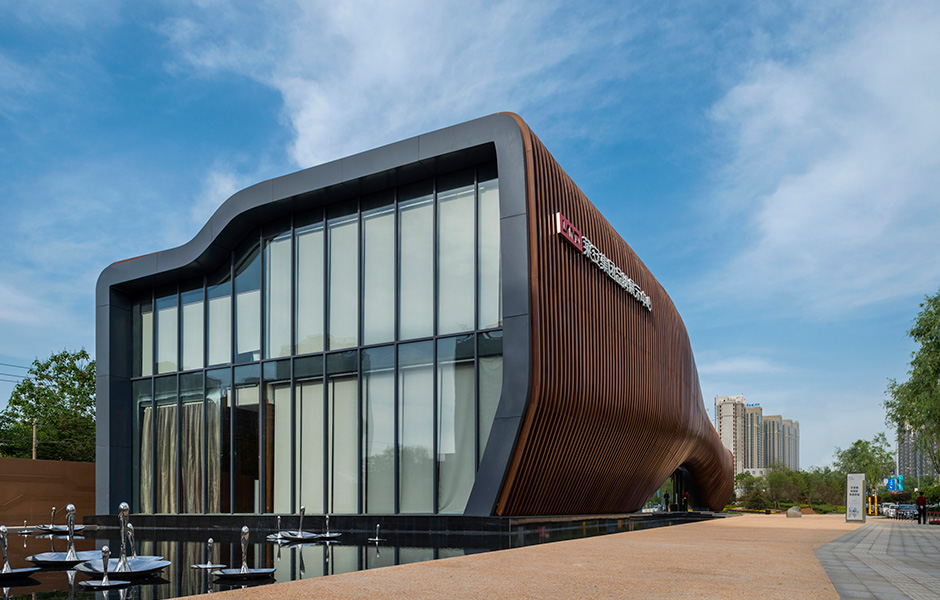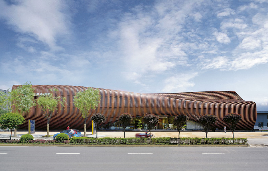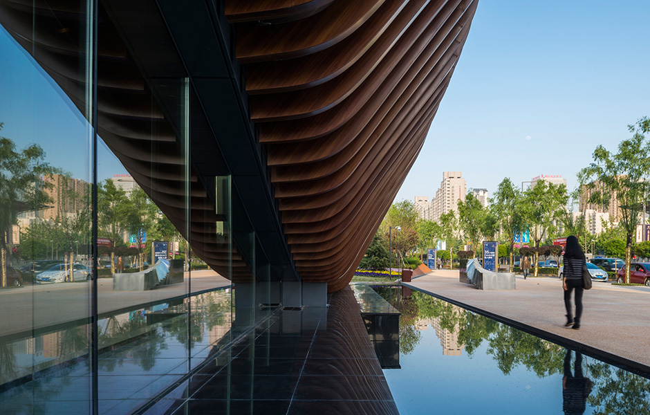 UTÖVER FORMEN STÅR upplevelsecentret ut på ett annat, avgörande sätt. En stor del av byggnaden, inklusive fasaden, är av trä. Det är ovanligt i Kina, där trä än så länge används ytterst marginellt som konstruktionsmaterial. Tonvikten ligger normalt på betong- och stålbyggen med glas.