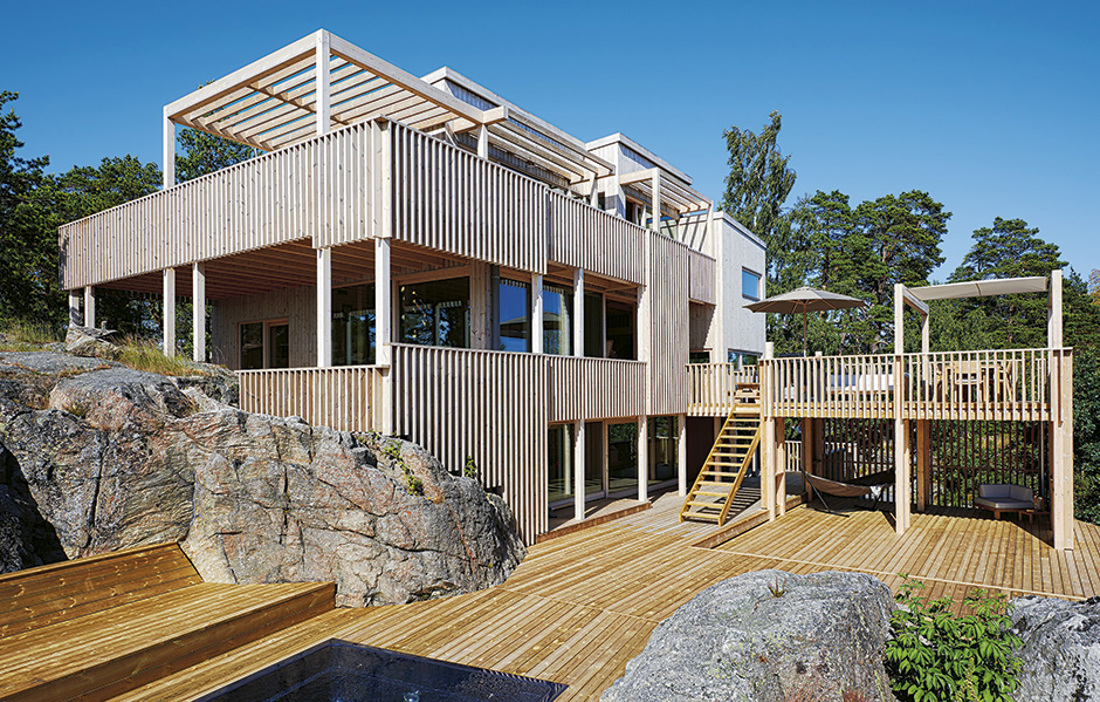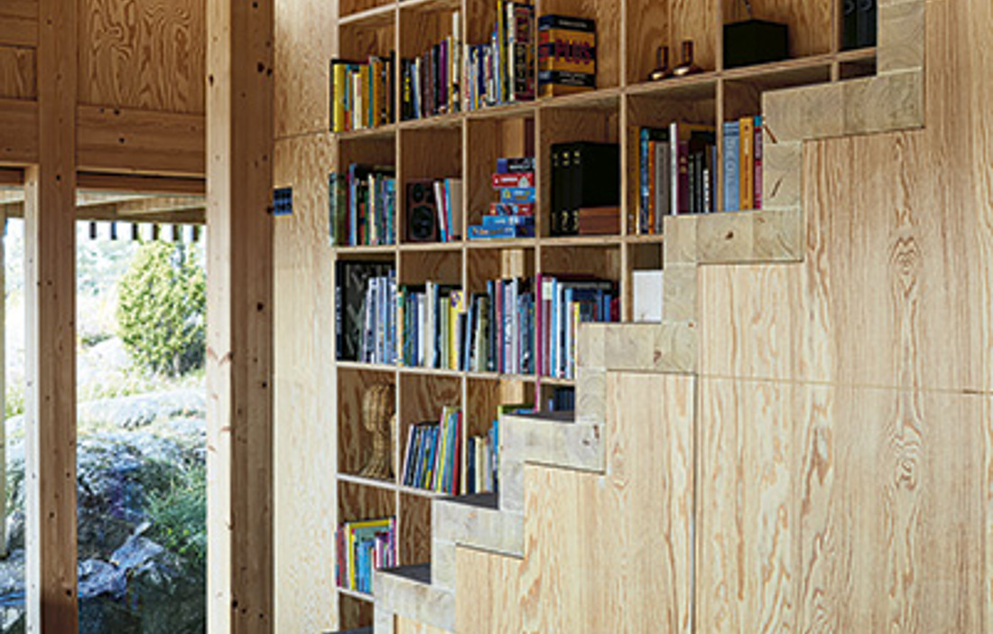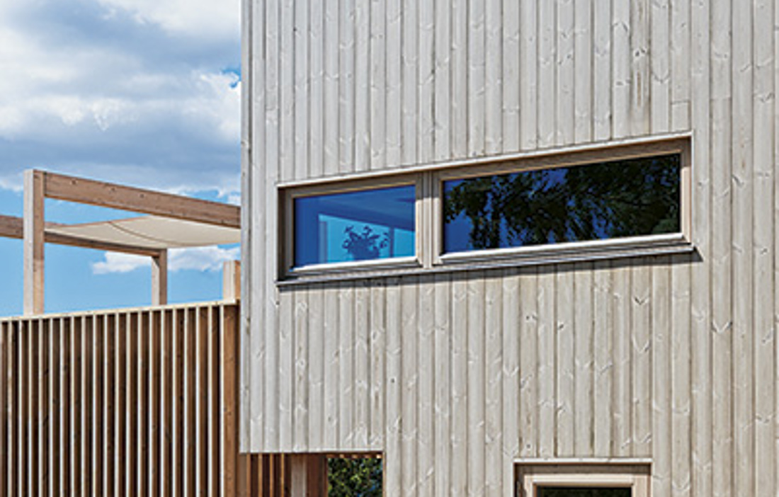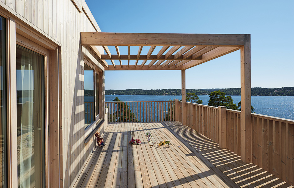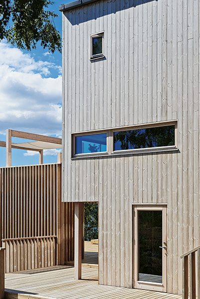Familjen Holm ville bygga med nordiska träslag. Valet föll på limträ i gran, värmebehandlad furu i fasad och innertak, furuplywood och massivgolv i furu.