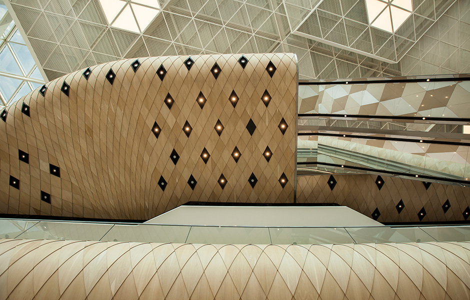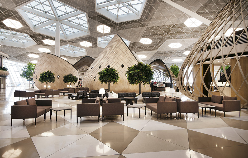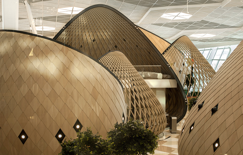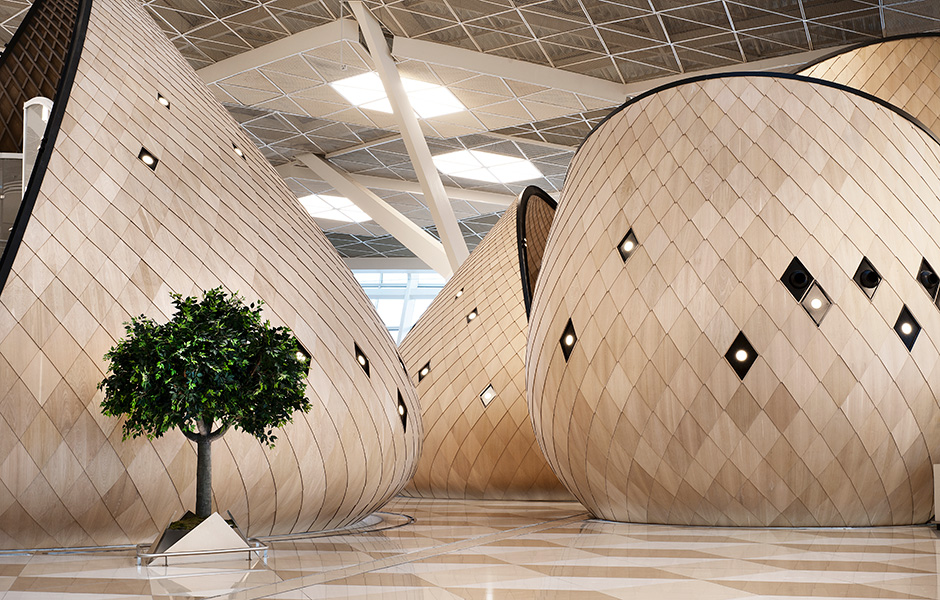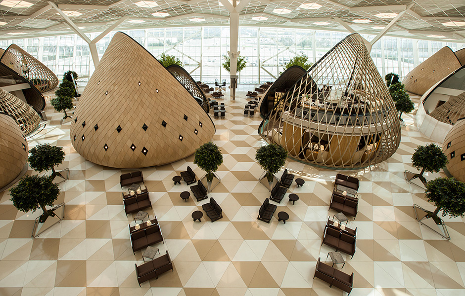 SEX MILJONER RESENÄRER passerar varje år genom flygplatsen Heydar Aliyev International Airport i Azerbadjans huvudstad Baku. Från och med i år möts resenärerna av sexton kokonger av flätade träpaneler, av ekplywood, när de kliver in på flygplatsen.