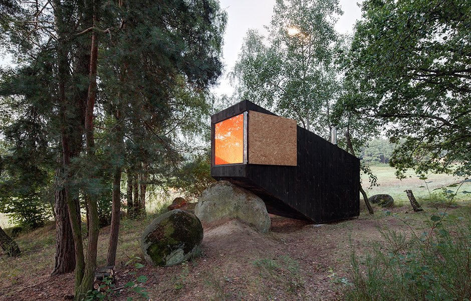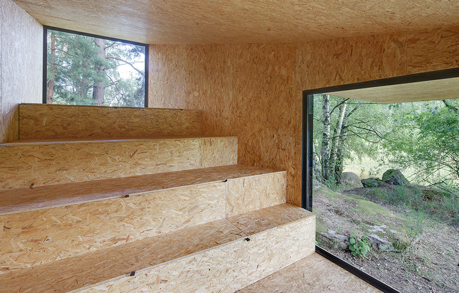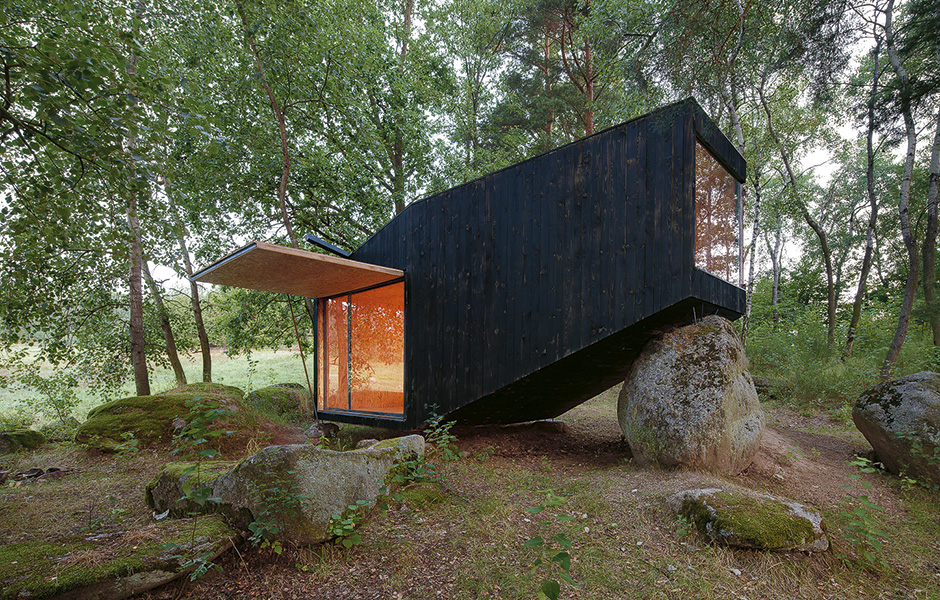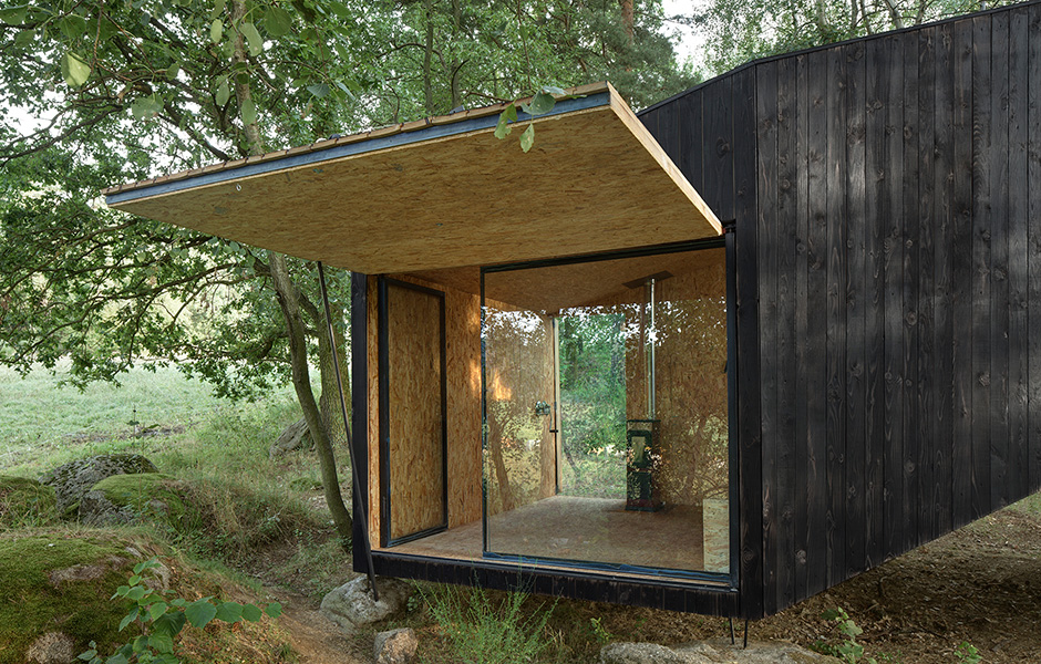 Den lilla stugan på 3,1 gånger 5,8 meter, lutar sig bekvämt mot en stenbumling och har stora glasfönster som kan stängas igen. Hela panelen på utsidan är i förkolnat trä – och allt trä kommer från nerfallna stammar från skogen intill.«