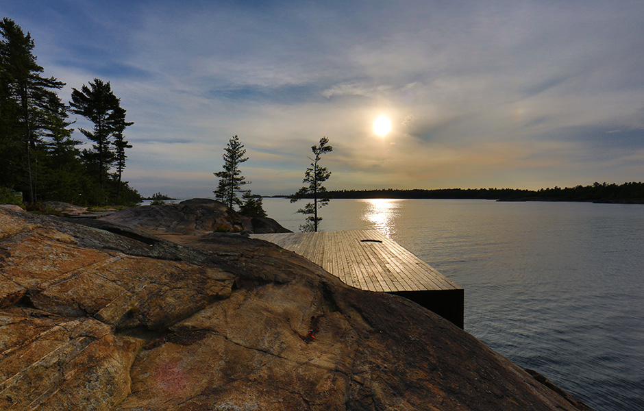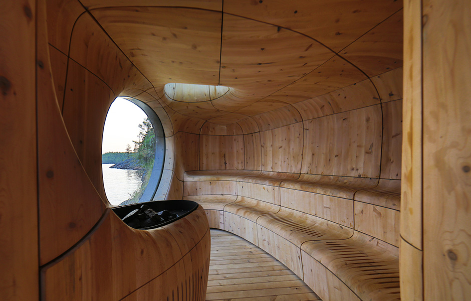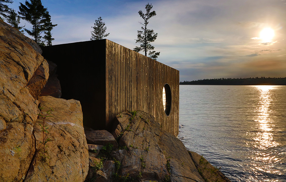 Enligt National Geographics är solnedgångarna över Lake Huron, norr om Toronto i Kanada, bland de vackraste i världen. Den kanadensiska arkitektbyrån Partisans lät sig inspireras av stenhällarnas formationer och mjuka rundningar när de skapade den här bastun.