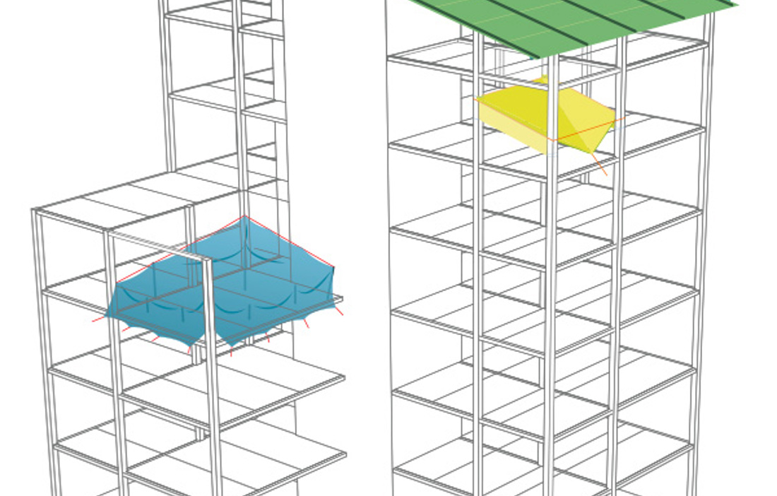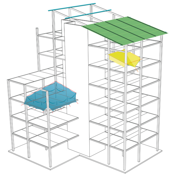 – Extoler är mer av en montagehall än ett väderskydd, säger Thomas Staflund som är säljledare på Martinsons. Eftersom det är fristående kan man snabbt höja sig mellan de olika våningarna. På ena gaveln finns en installationszon där lastbilar kan backa in. Med hjälp av traversen kan man sedan lyfta av materialet under tak vilket eliminerar risken för fukt.