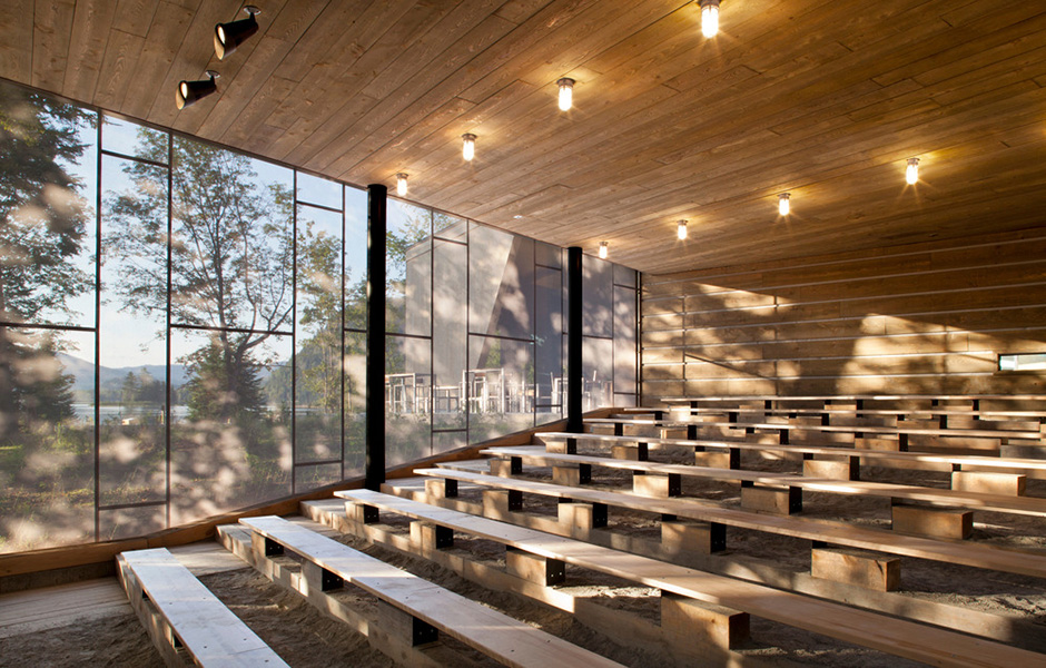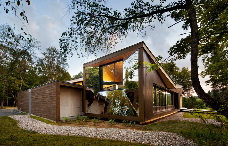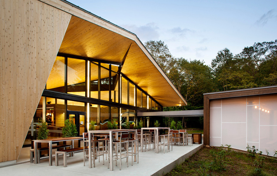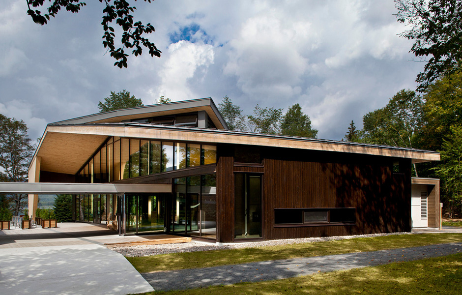 Upplevelsecentret ligger naturskönt vid Lake Monroe utanför Québec och för arkitekten Daniel Smith var det en utmaning att passa in byggnaden i nationalparken på ett naturligt sätt. Tack vare timmerfasaderna och de vinklade spegelglasfönstren som reflekterar träden utanför, smälter centret fint in i naturen. Solen kan strömma in genom de stora takfönstren och värmer upp lokalerna vintertid, medan man sommartid kan öppna fönstren och låta den svala brisen svalka besökarna.